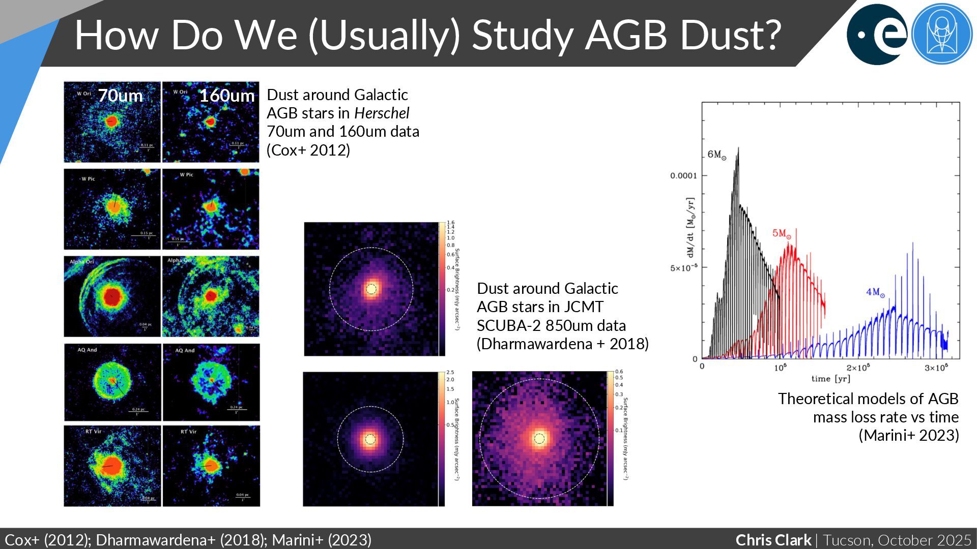 Study AGB Dust? Cox+ (2012); Dharmawardena+ (2018); Marini+ (2023) Dust around Galactic AGB stars in Herschel 70um and 160um data (Cox+ 2012) 70um 160um Theoretical models of AGB mass loss rate vs time (Marini+ 2023) Dust around Galactic AGB stars in JCMT SCUBA-2 850um data (Dharmawardena + 2018)