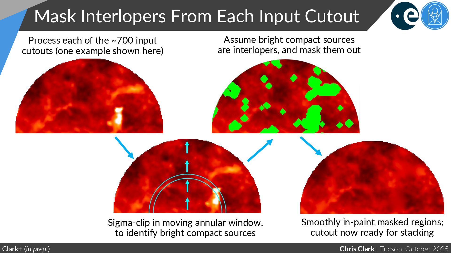 Input Cutout Clark+ (in prep.) Sigma-clip in moving annular window, to identify bright compact sources Process each of the ~700 input cutouts (one example shown here) Assume bright compact sources are interlopers, and mask them out Smoothly in-paint masked regions; cutout now ready for stacking