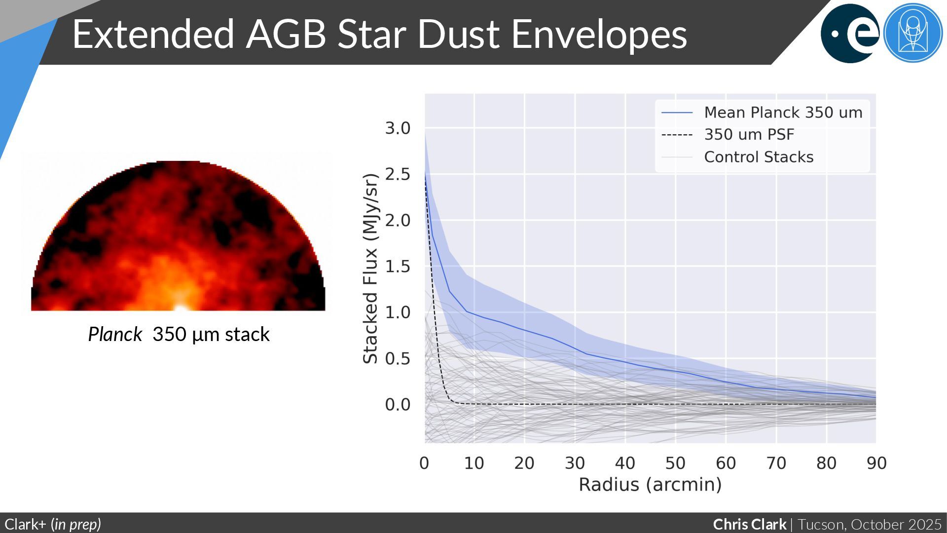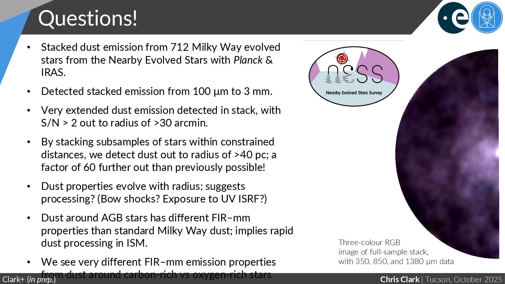 Three-colour RGB image of full-sample stack, with 350, 850, and 1380 μm data • Stacked dust emission from 712 Milky Way evolved stars from the Nearby Evolved Stars with Planck & IRAS. • Detected stacked emission from 100 μm to 3 mm. • Very extended dust emission detected in stack, with S/N > 2 out to radius of >30 arcmin. • By stacking subsamples of stars within constrained distances, we detect dust out to radius of >40 pc; a factor of 60 further out than previously possible! • Dust properties evolve with radius; suggests processing? (Bow shocks? Exposure to UV ISRF?) • Dust around AGB stars has different FIR–mm properties than standard Milky Way dust; implies rapid dust processing in ISM. • We see very different FIR–mm emission properties from dust around carbon-rich vs oxygen-rich stars