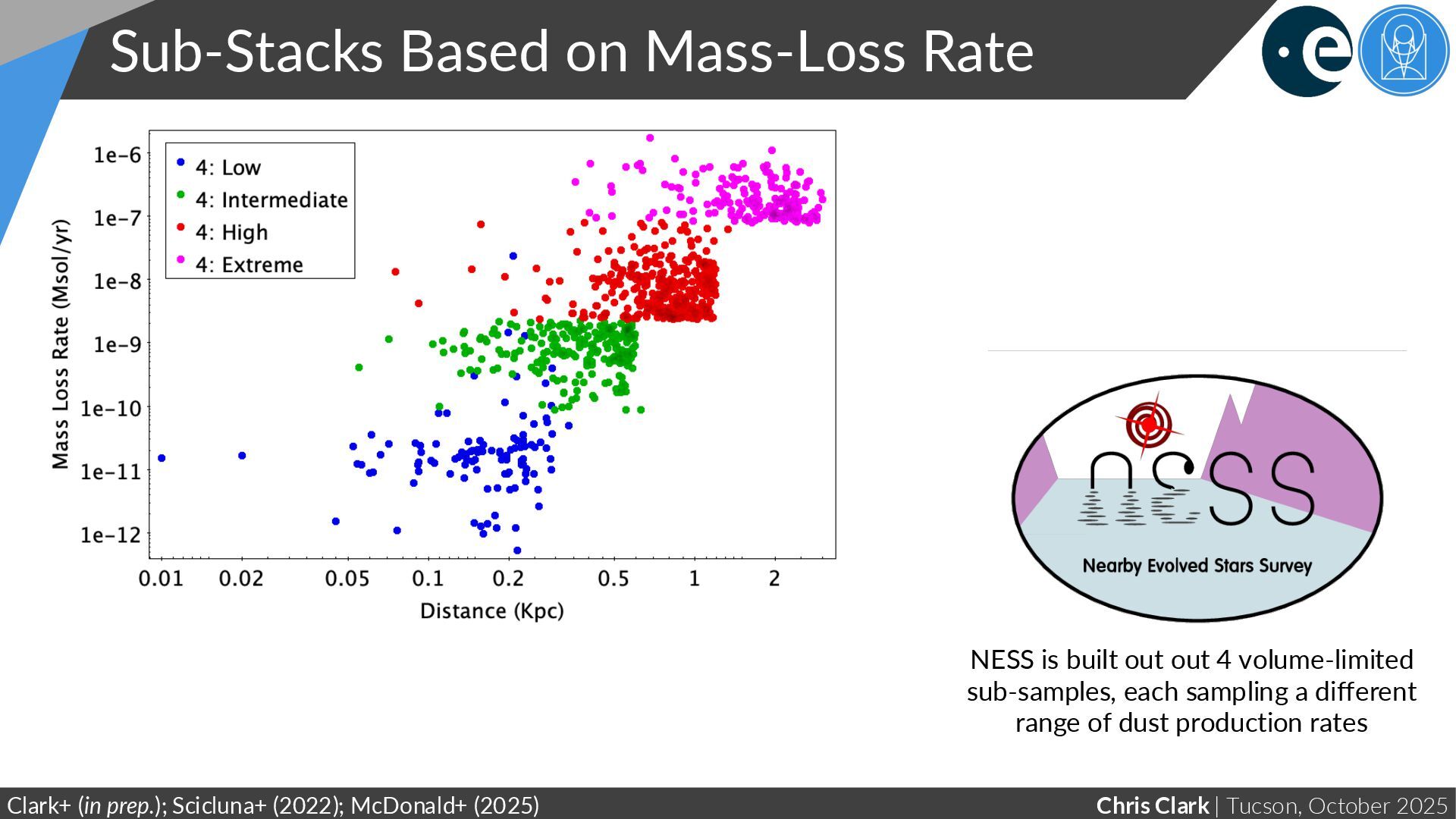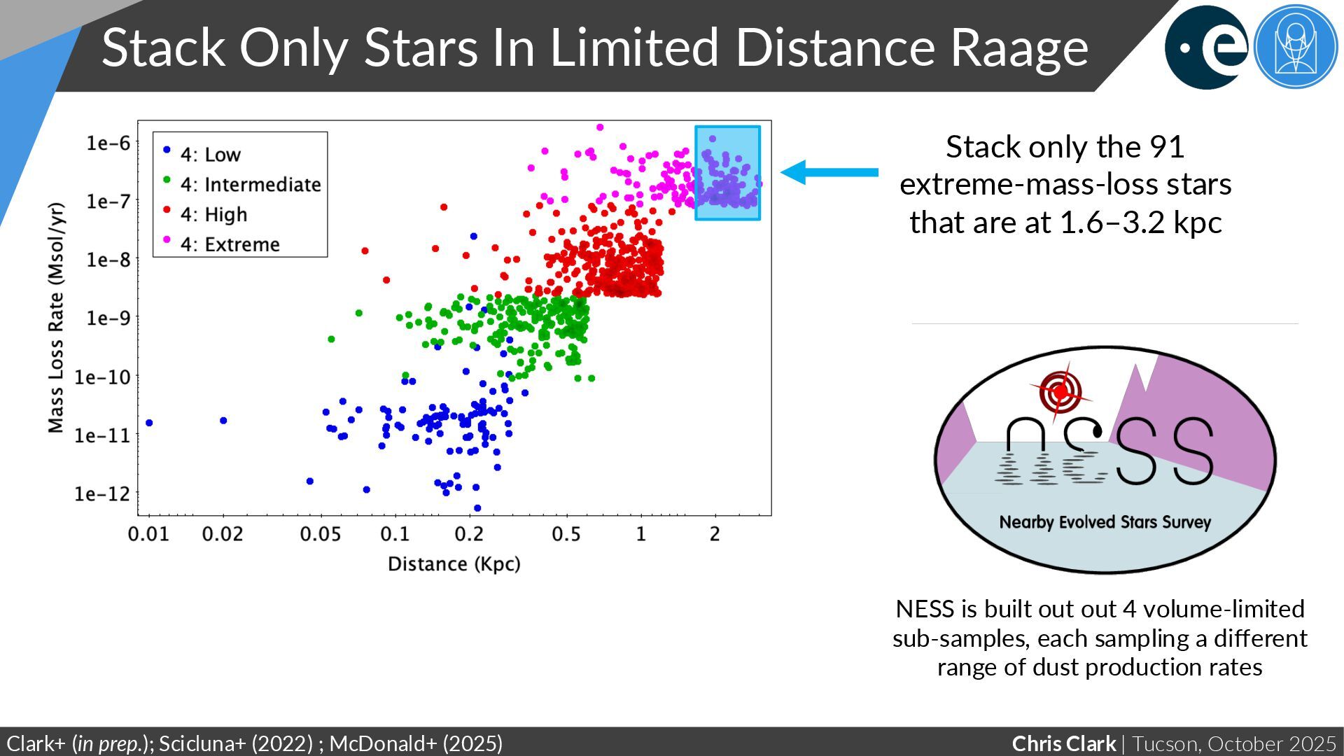 Limited Distance Raage Clark+ (in prep.); Scicluna+ (2022) ; McDonald+ (2025) NESS is built out out 4 volume-limited sub-samples, each sampling a different range of dust production rates Stack only the 91 extreme-mass-loss stars that are at 1.6–3.2 kpc