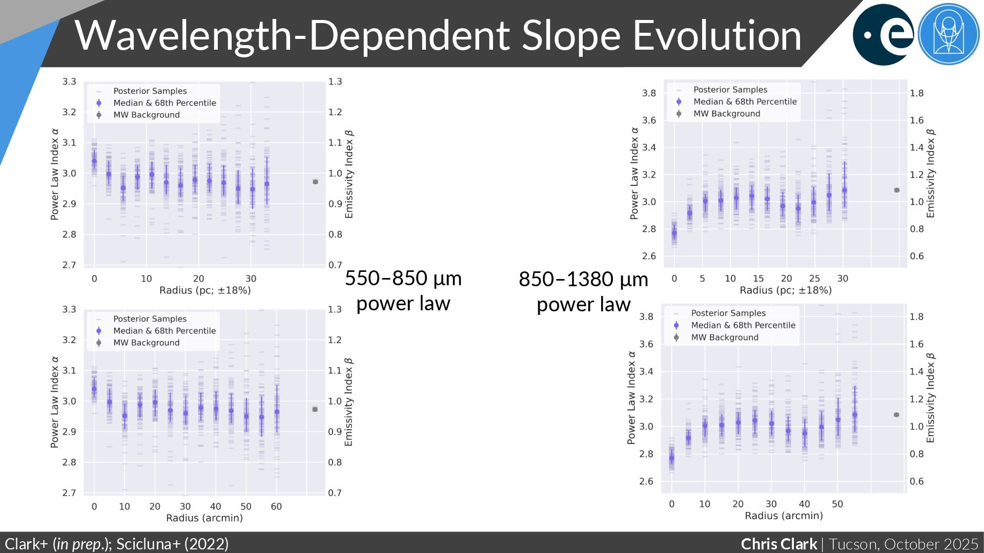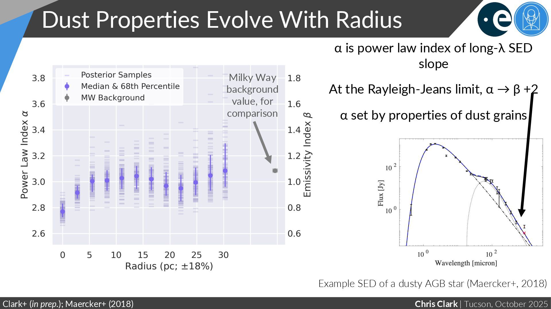 Radius Clark+ (in prep.); Maercker+ (2018) α is power law index of long-λ SED slope At the Rayleigh-Jeans limit, α → β +2 α set by properties of dust grains Milky Way background value, for comparison Example SED of a dusty AGB star (Maercker+, 2018)