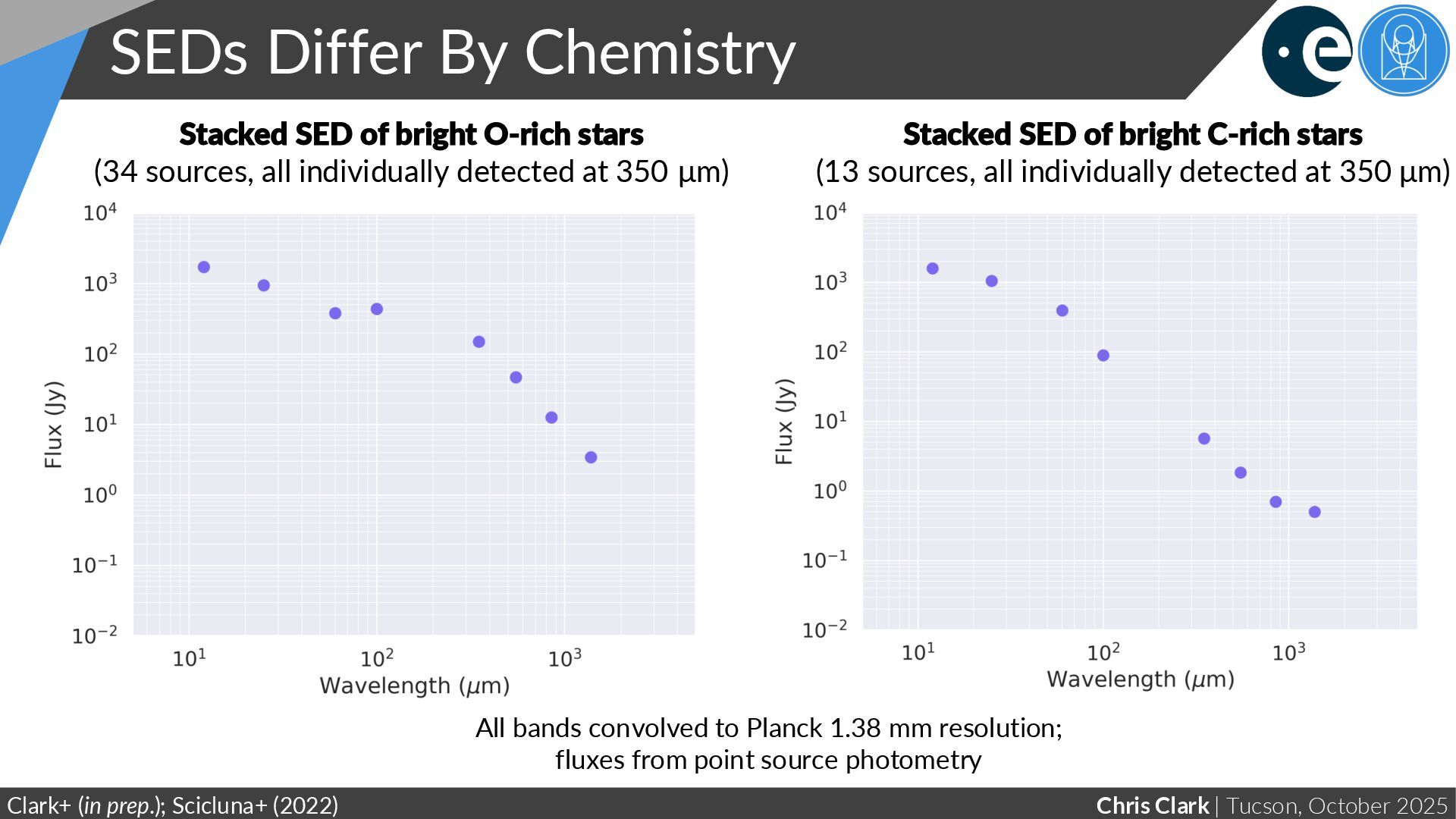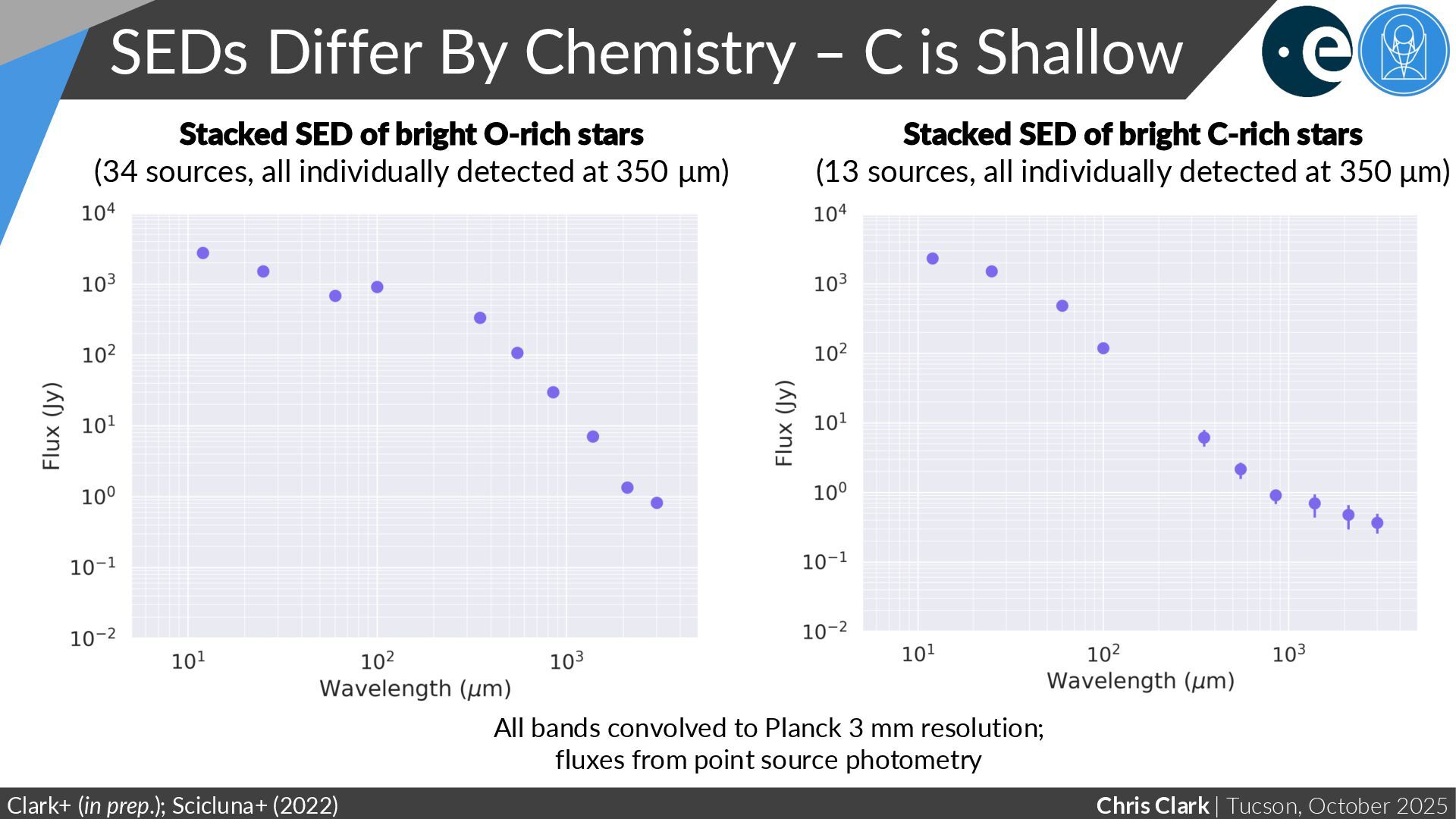 – C is Shallow Clark+ (in prep.); Scicluna+ (2022) All bands convolved to Planck 3 mm resolution; fluxes from point source photometry Stacked SED of bright O-rich stars (34 sources, all individually detected at 350 μm) Stacked SED of bright C-rich stars (13 sources, all individually detected at 350 μm)