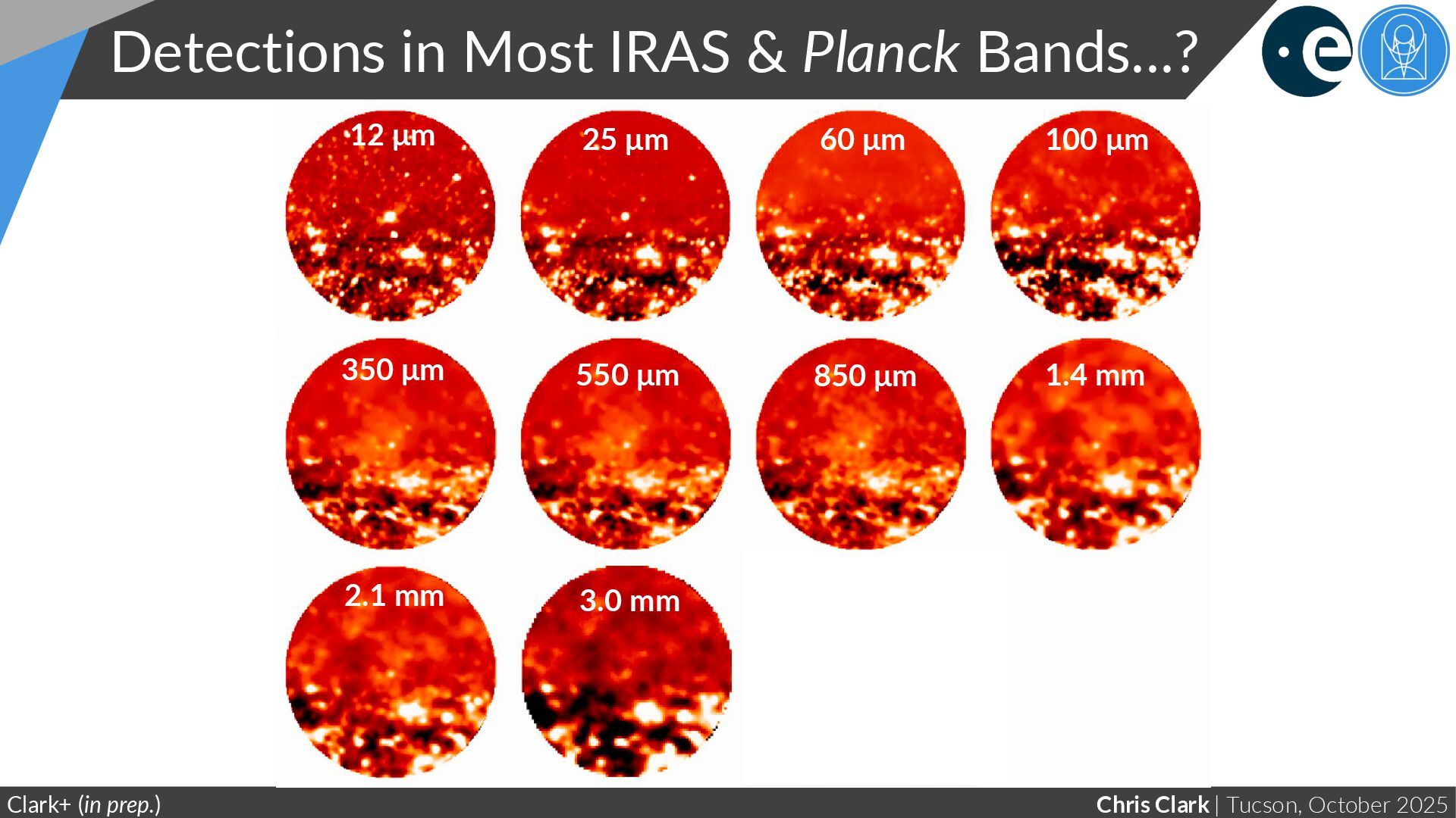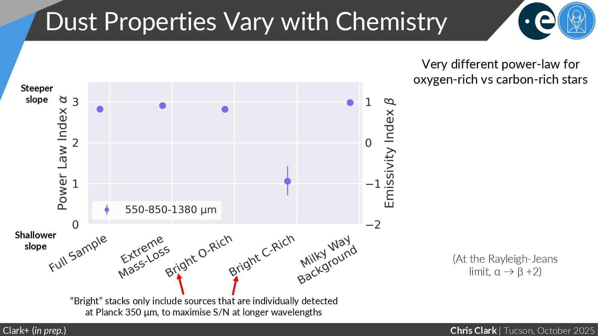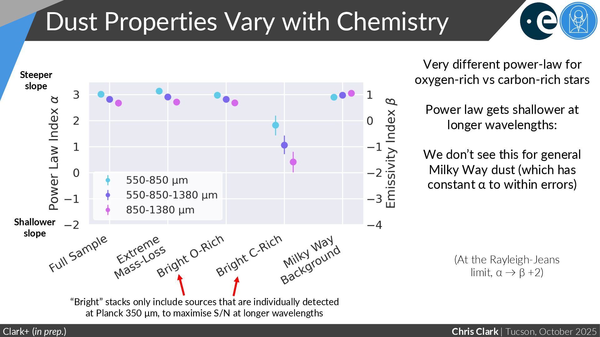 Chemistry Clark+ (in prep.) Steeper slope Shallower slope Very different power-law for oxygen-rich vs carbon-rich stars “Bright” stacks only include sources that are individually detected at Planck 350 μm, to maximise S/N at longer wavelengths (At the Rayleigh-Jeans limit, α → β +2)