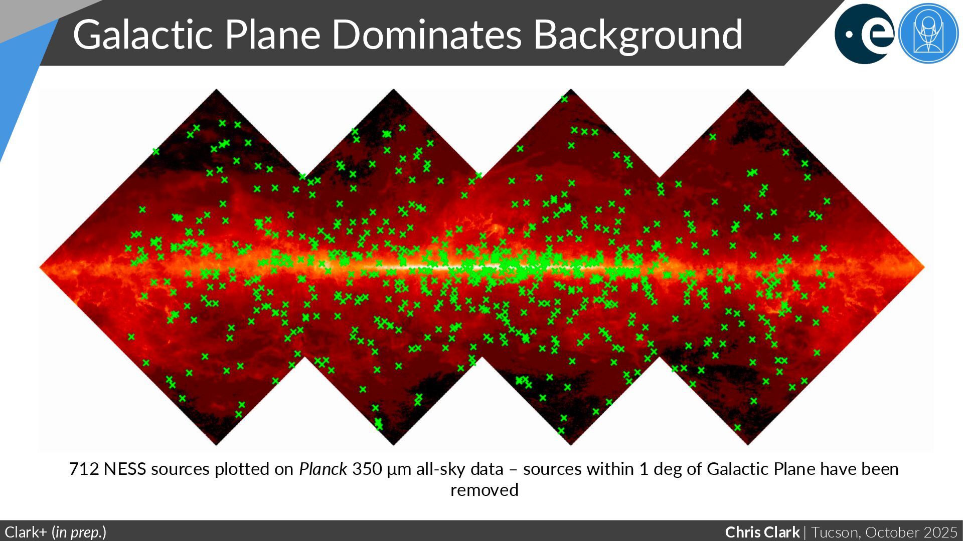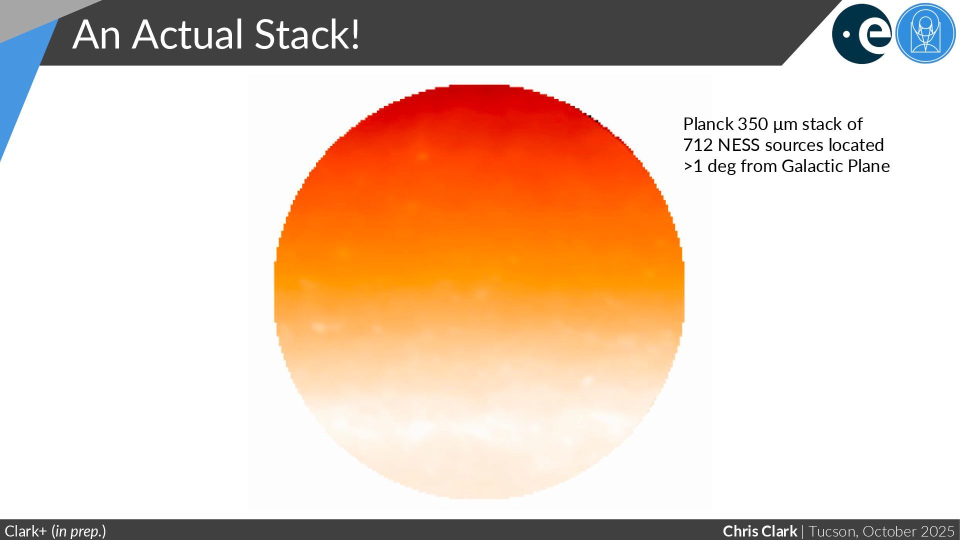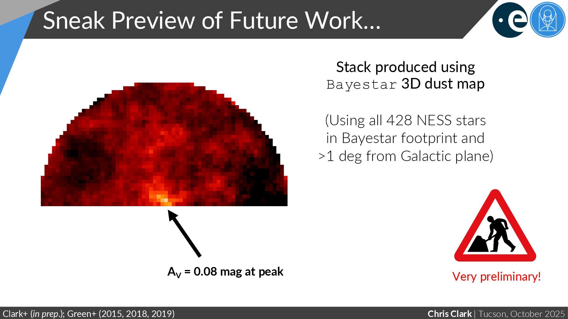 Work… Clark+ (in prep.); Green+ (2015, 2018, 2019) Stack produced using Bayestar 3D dust map (Using all 428 NESS stars in Bayestar footprint and >1 deg from Galactic plane) AV = 0.08 mag at peak Very preliminary!