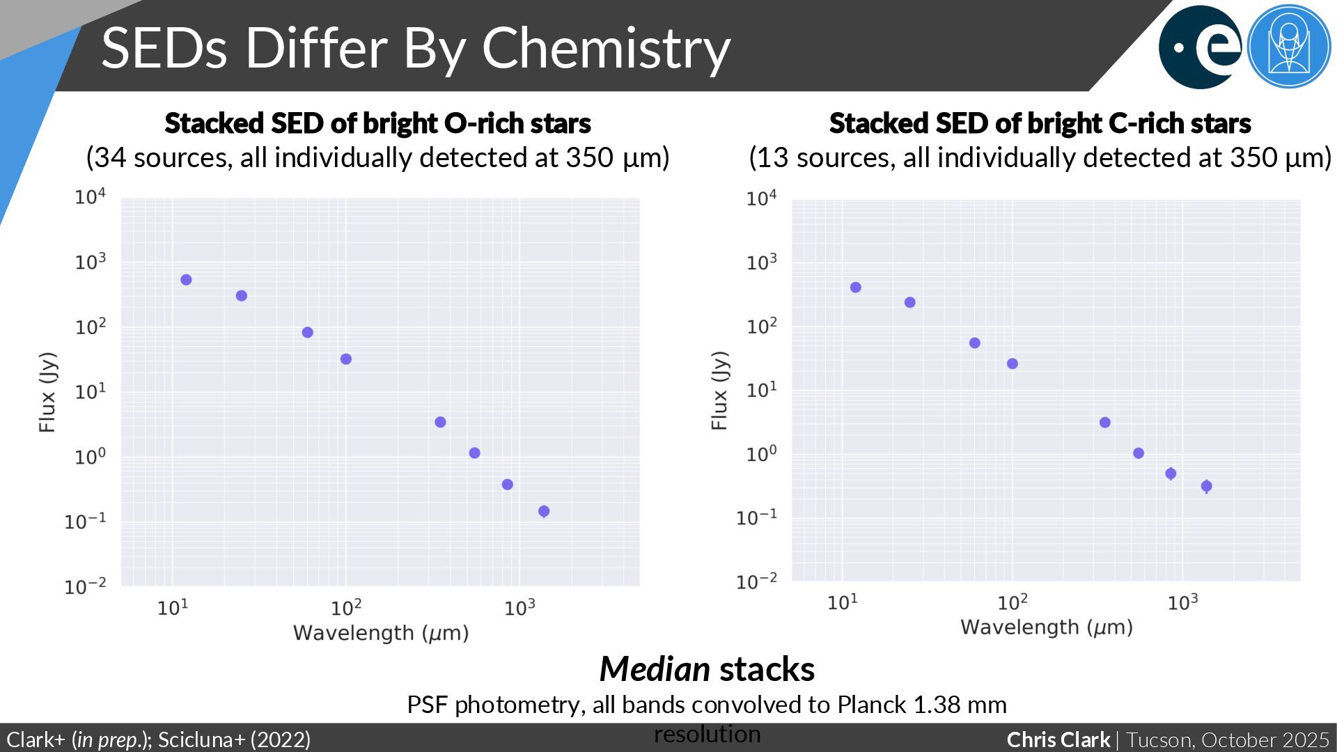 Clark+ (in prep.); Scicluna+ (2022) Median stacks PSF photometry, all bands convolved to Planck 1.38 mm resolution Stacked SED of bright O-rich stars (34 sources, all individually detected at 350 μm) Stacked SED of bright C-rich stars (13 sources, all individually detected at 350 μm)