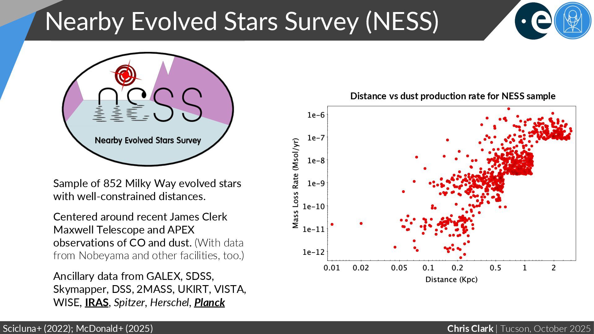 (NESS) Scicluna+ (2022); McDonald+ (2025) Sample of 852 Milky Way evolved stars with well-constrained distances. Centered around recent James Clerk Maxwell Telescope and APEX observations of CO and dust. (With data from Nobeyama and other facilities, too.) Ancillary data from GALEX, SDSS, Skymapper, DSS, 2MASS, UKIRT, VISTA, WISE, IRAS, Spitzer, Herschel, Planck Distance vs dust production rate for NESS sample