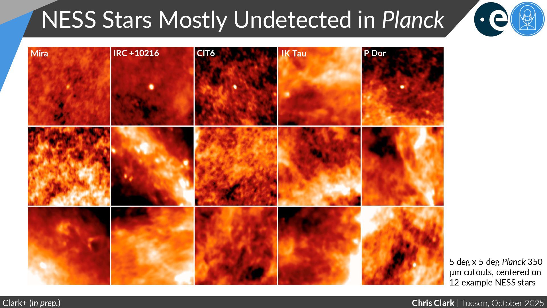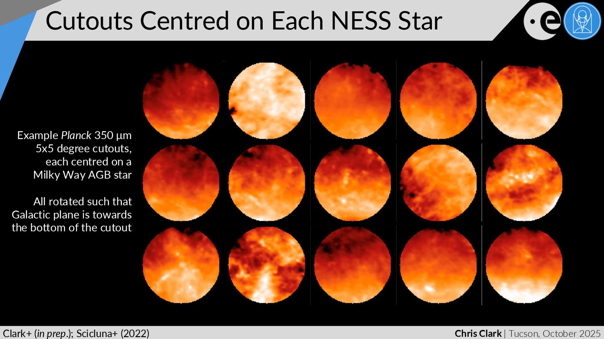 NESS Star Clark+ (in prep.); Scicluna+ (2022) Example Planck 350 μm 5x5 degree cutouts, each centred on a Milky Way AGB star All rotated such that Galactic plane is towards the bottom of the cutout
