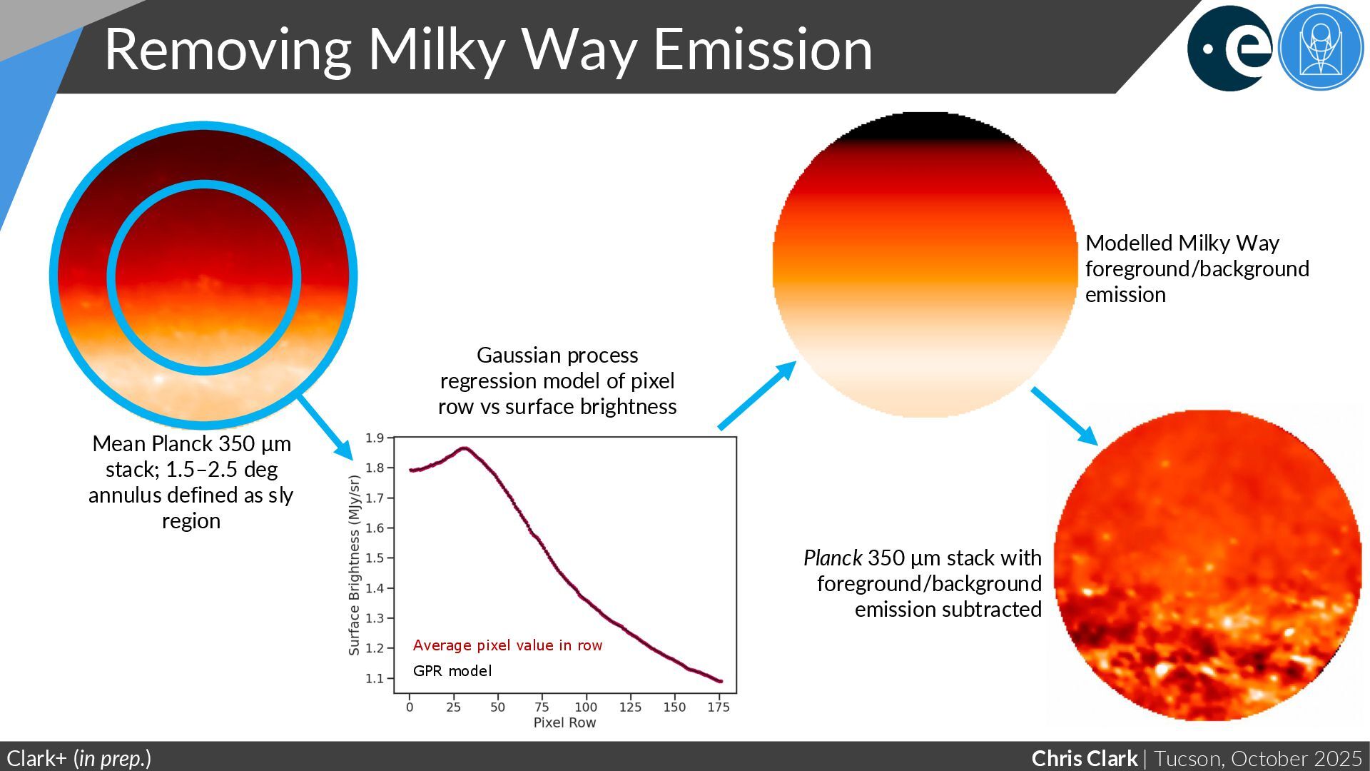Clark+ (in prep.) Planck 350 μm stack with foreground/background emission subtracted Gaussian process regression model of pixel row vs surface brightness Mean Planck 350 μm stack; 1.5–2.5 deg annulus defined as sly region Average pixel value in row GPR model Modelled Milky Way foreground/background emission