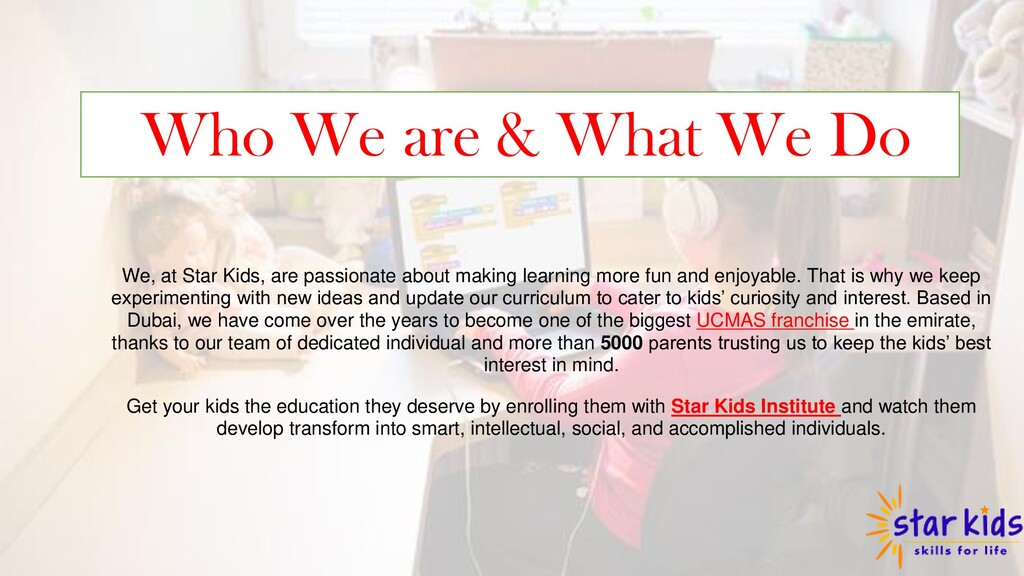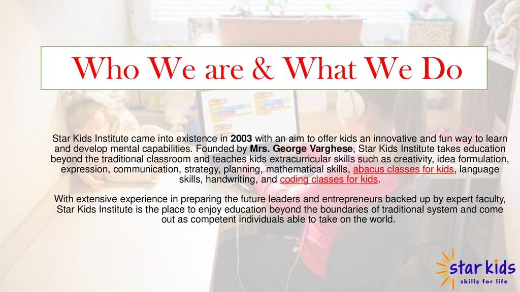 Star Kids Institute came into existence in 2003 with an aim to offer kids an innovative and fun way to learn and developmental capabilities. Founded by Mrs. George Varghese, Star Kids Institute takes education beyond the traditional classroom and teaches kids extracurricular skills such as creativity, idea formulation, expression, communication, strategy, planning, mathematical skills, language skills, handwriting, and computer programming.