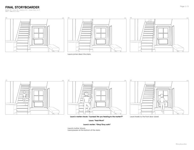 | Aspect Ratio: 16 : 9 DRAFT: MARCH 22, 2022 Page: 1 / 5 1A 0:00 2A 0:01 Laura comes down the stairs. 3A 0:02 4A 0:03 5A 0:04 Laura's mother shouts: "Lauraaa! Are you heading to the market?!" Laura: "Yeah Mom!" Laura's mother: "Okay! Stay safe!" Laura's mother shouts. Laura pauses at the bottom of the stairs. 6A 0:05 Laura heads to the front door closet.