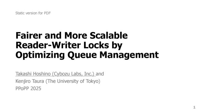 Michael L. Scott. 1991. Algorithms for Scalable Synchronization on Shared-Memory Multiprocessors. ACM Trans. Comput. Syst. 9, 1 (Feb. 1991), 21–65. • Mellor-Crummey+ 1991b • John M. Mellor-Crummey and Michael L. Scott. 1991. Scalable Reader-Writer Synchronization for Shared-Memory Multiprocessors. SIGPLAN Not. 26, 7 (April 1991), 106–113. • Brandenburg+ 2010 • Björn B. Brandenburg and James H. Anderson. 2010. Spin-based reader-writer synchronization for multiprocessor real-time systems. Real-Time Systems 46 (2010), 25–87. • Calciu+ 2013 • Irina Calciu, Dave Dice, Yossi Lev, Victor Luchangco, Virendra J. Marathe, and Nir Shavit. 2013. NUMA- Aware Reader-Writer Locks. In Proceedings of the 18th ACM SIGPLAN Symposium on Principles and Practice of Parallel Programming (PPoPP ’13). Association for Computing Machinery, New York, NY, USA, 157–166. 23