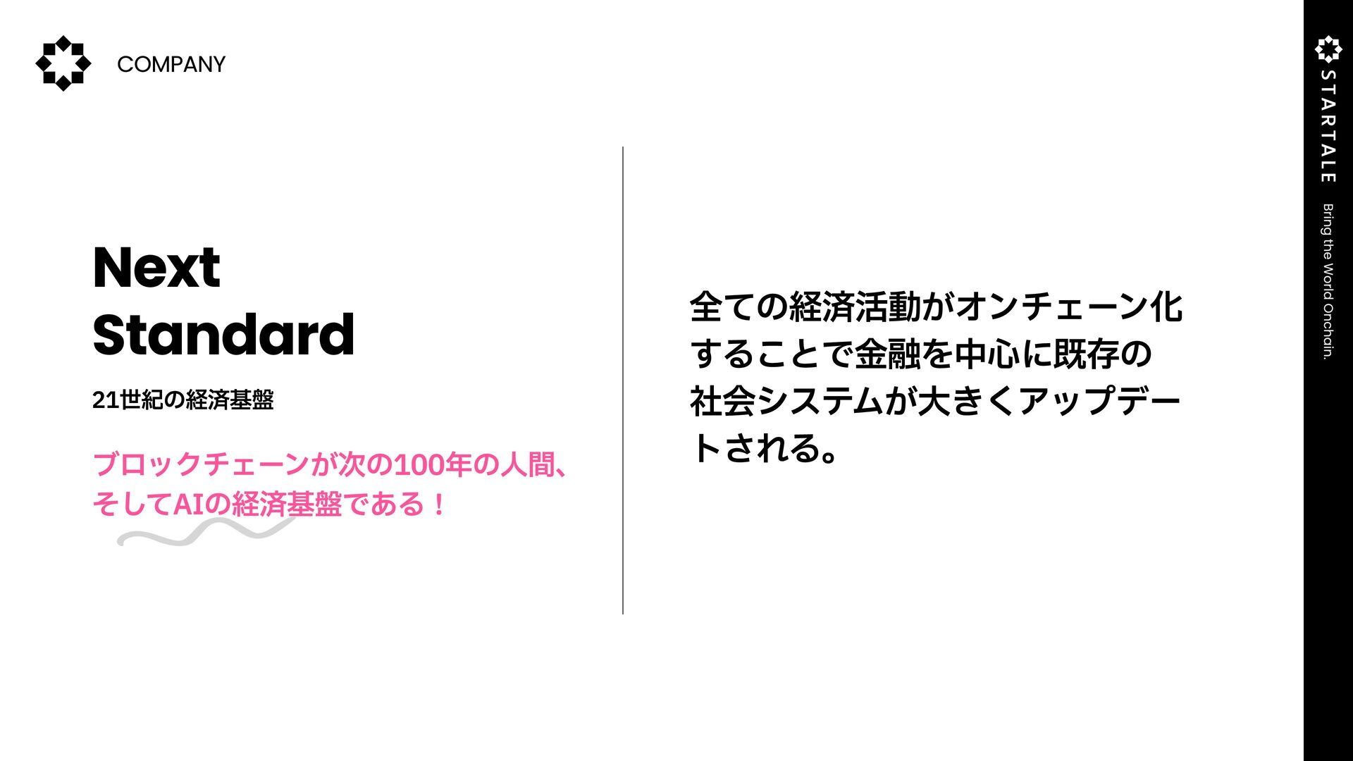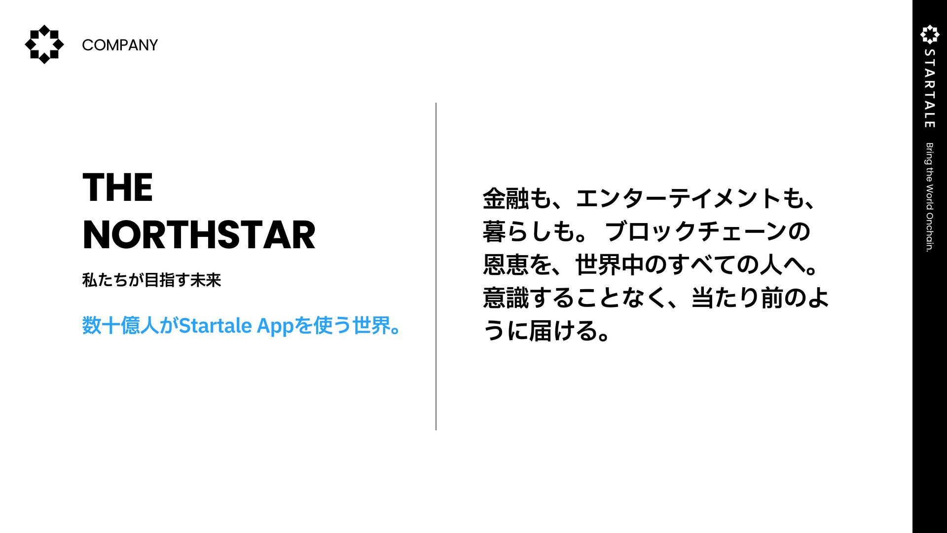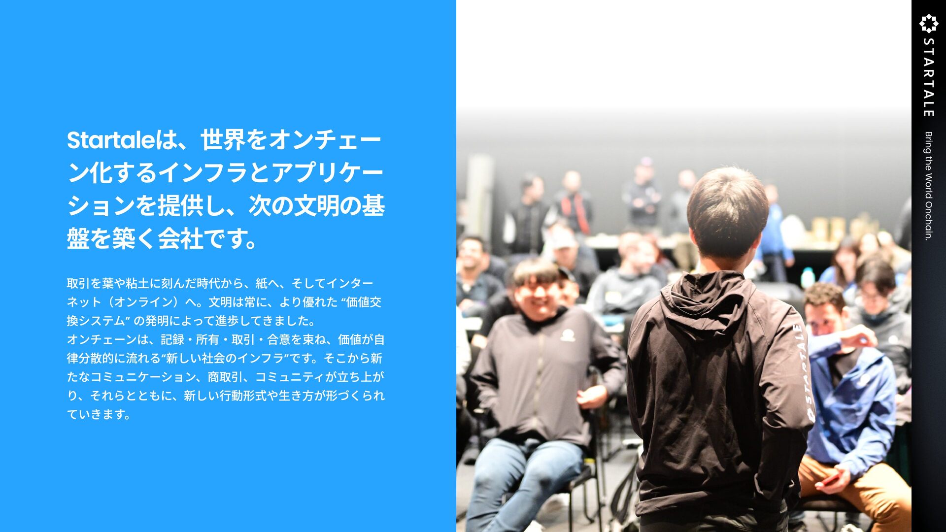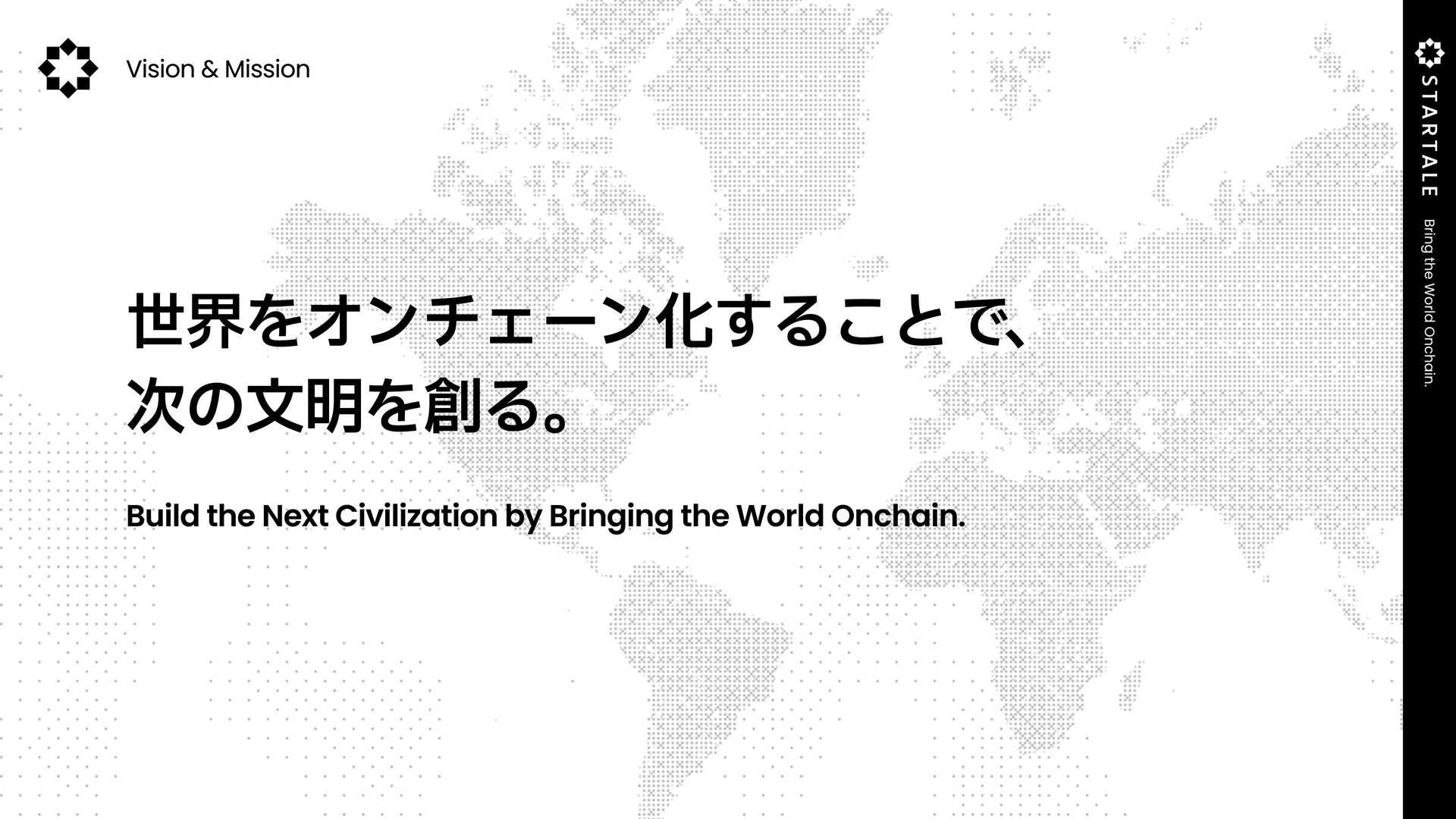 Startaleは、世界をオンチェーン化するインフラとアプリケーションを提供し、次の文明の基盤を築く会社です。このデッキでは、弊社のビジョンやミッション、またビジネス展開とチーム編成をまとめています。