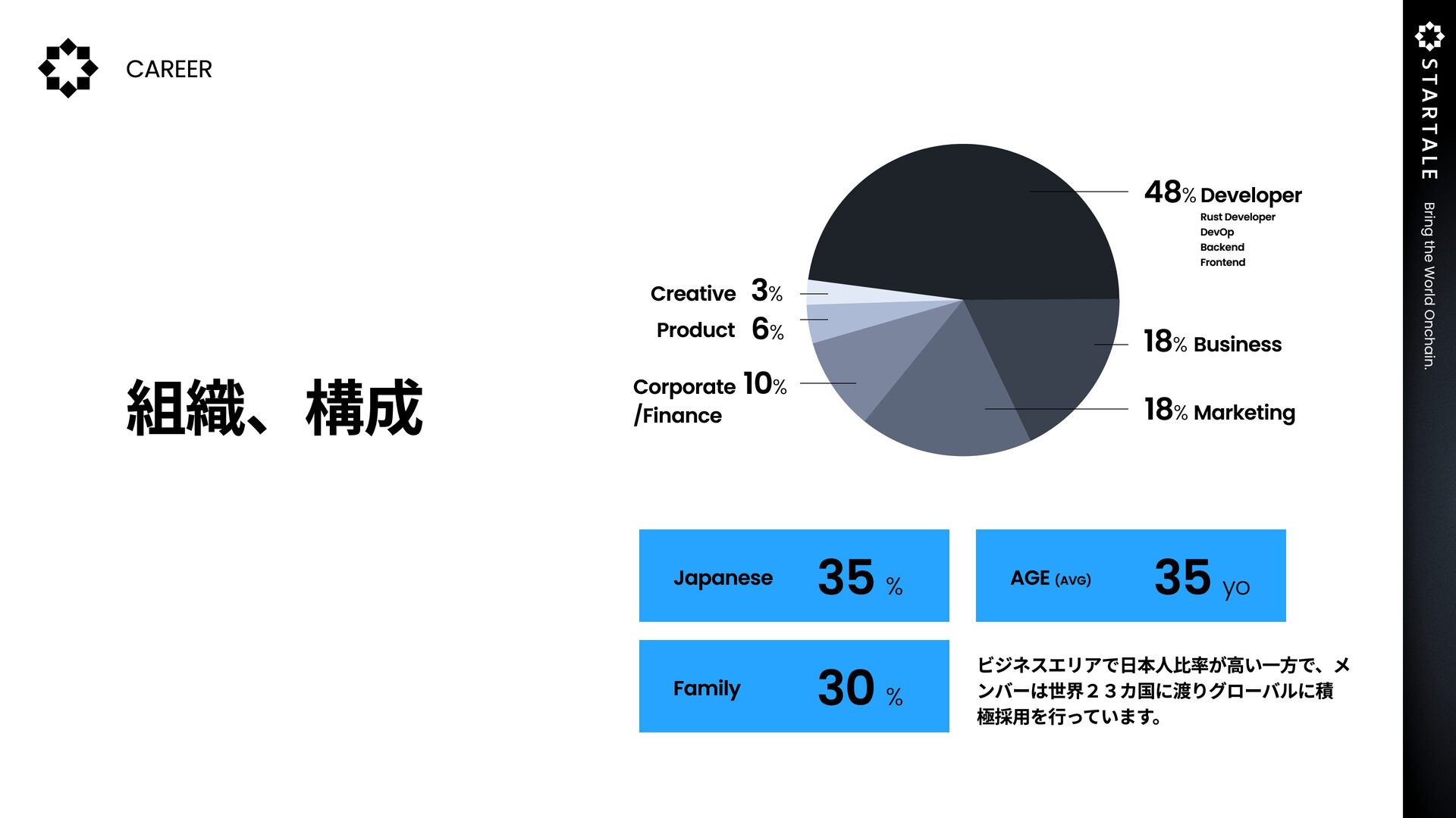 r l d O n c h a i n . DTË  CA RE ER De vel ope r 48 % 18% 18% 10 % 6% 3% Cr ea tiv e Business C o r p o r a t e / F i n a n c e Ma rke ting Product Rust Develope r Dev Op Ba ck end Frontend 35 % 30 % Ja pa nes e Fa mil y 35 yo AGE (AVG ) Ó ¸ Í ¹ ¨ ê ¢ g å , º Ô ⁄ L Ø D ¹ g  á ó Ð ü o  L   « ý k ! − ° í ü Ð ë k M u ¡ ( ™ L c f D ~ Y