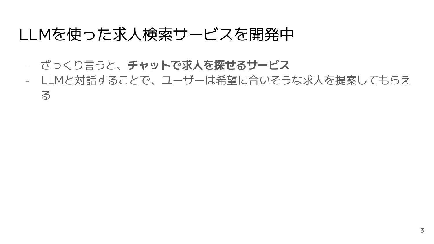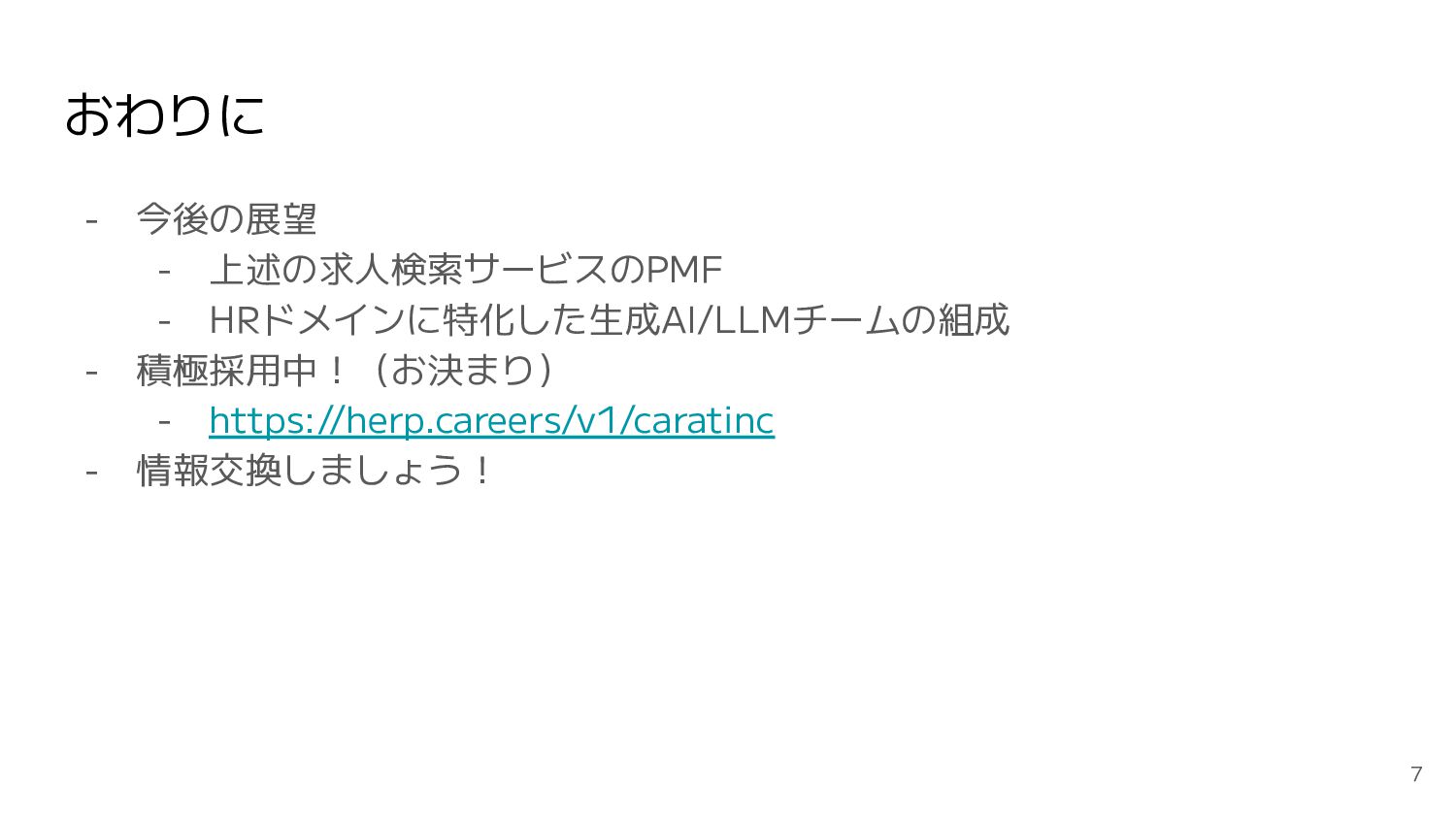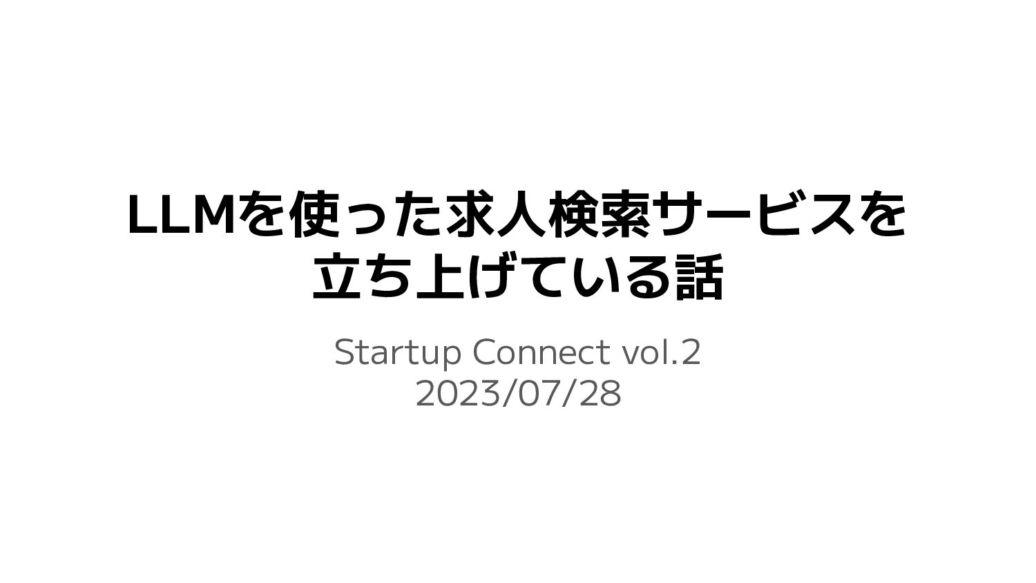 タイトル:LLMを使った求人検索サービスを 立ち上げている話 発表者:斎藤陽介(株式会社Carat CTO) イベント:StartupConnect vol.2 - 開催テーマ: 生成系AI - 開催日付: 2023/07/28 - 開催場所: 株式会社welldayオフィス