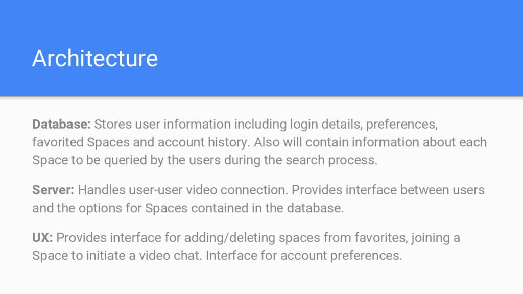 and account history. Also will contain information about each Space to be queried by the users during the search process. Server: Handles user-user video connection. Provides interface between users and the options for Spaces contained in the database. UX: Provides interface for adding/deleting spaces from favorites, joining a Space to initiate a video chat. Interface for account preferences. Architecture