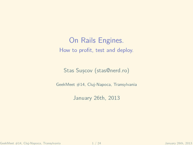 mountable, engine close to a full app, has routes, controllers, views and assets Right: simple, close to a generic gem structure; ideal to build Rails specific gems (generators, assets, etc. . . ) Tip: avoid characters like - or in engine names. ~$ rails plugin new gmengine --skip-test-unit --mountable create README.rdoc create Rakefile create gmengine.gemspec create MIT-LICENSE create Gemfile create app create app/controllers/gmengine/application_controller.rb create app/helpers/gmengine/application_helper.rb create app/views/layouts/gmengine/application.html.erb create app/assets/images/gmengine create config/routes.rb create lib/gmengine.rb create lib/tasks/gmengine_tasks.rake create lib/gmengine/version.rb create lib/gmengine/engine.rb create app/assets/stylesheets/gmengine/application.css create app/assets/javascripts/gmengine/application.js create script create script/rails run bundle install ~$ rails plugin new gmengine --skip-test-unit create README.rdoc create Rakefile create gmengine.gemspec create MIT-LICENSE create Gemfile create lib/gmengine.rb create lib/tasks/gmengine_tasks.rake create lib/gmengine/version.rb run bundle install GeekMeet #14, Cluj-Napoca, Transylvania 9 / 24 January 26th, 2013