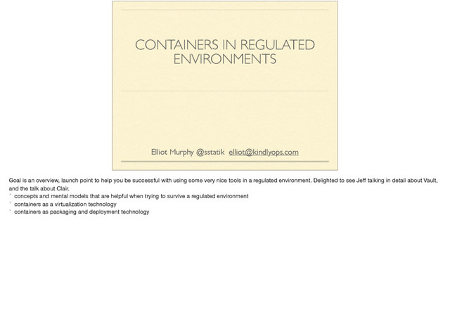 an overview, launch point to help you be successful with using some very nice tools in a regulated environment. Delighted to see Jeff talking in detail about Vault, and the talk about Clair. * concepts and mental models that are helpful when trying to survive a regulated environment * containers as a virtualization technology * containers as packaging and deployment technology