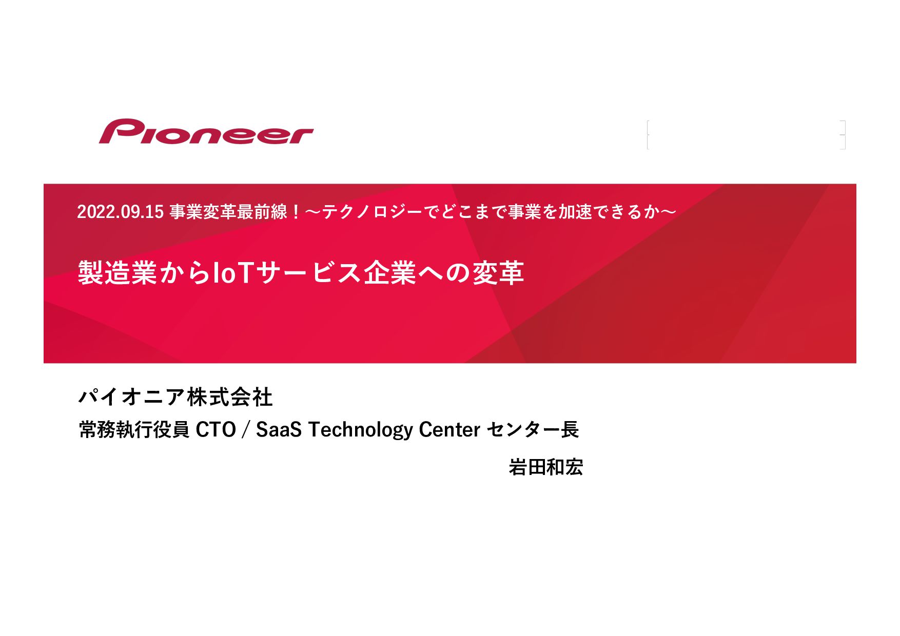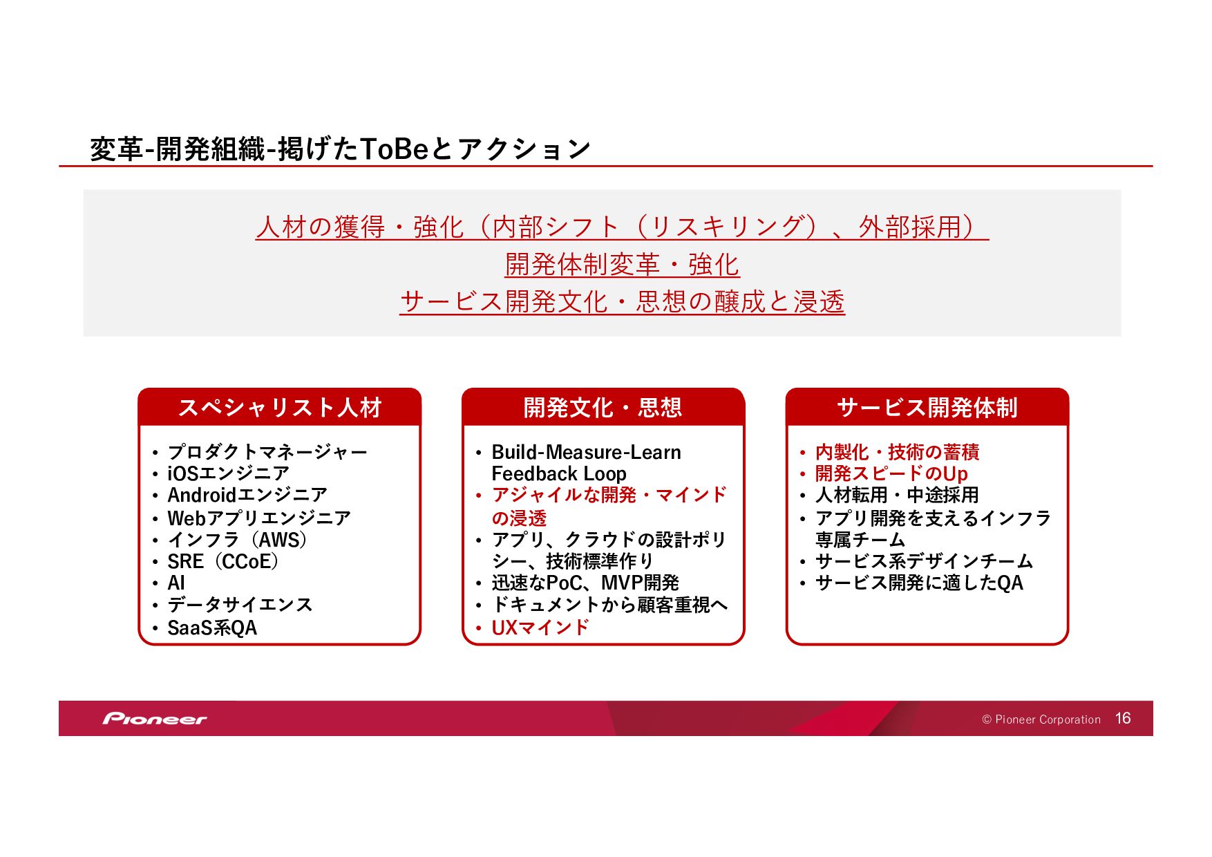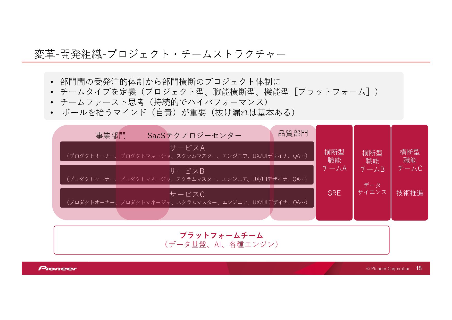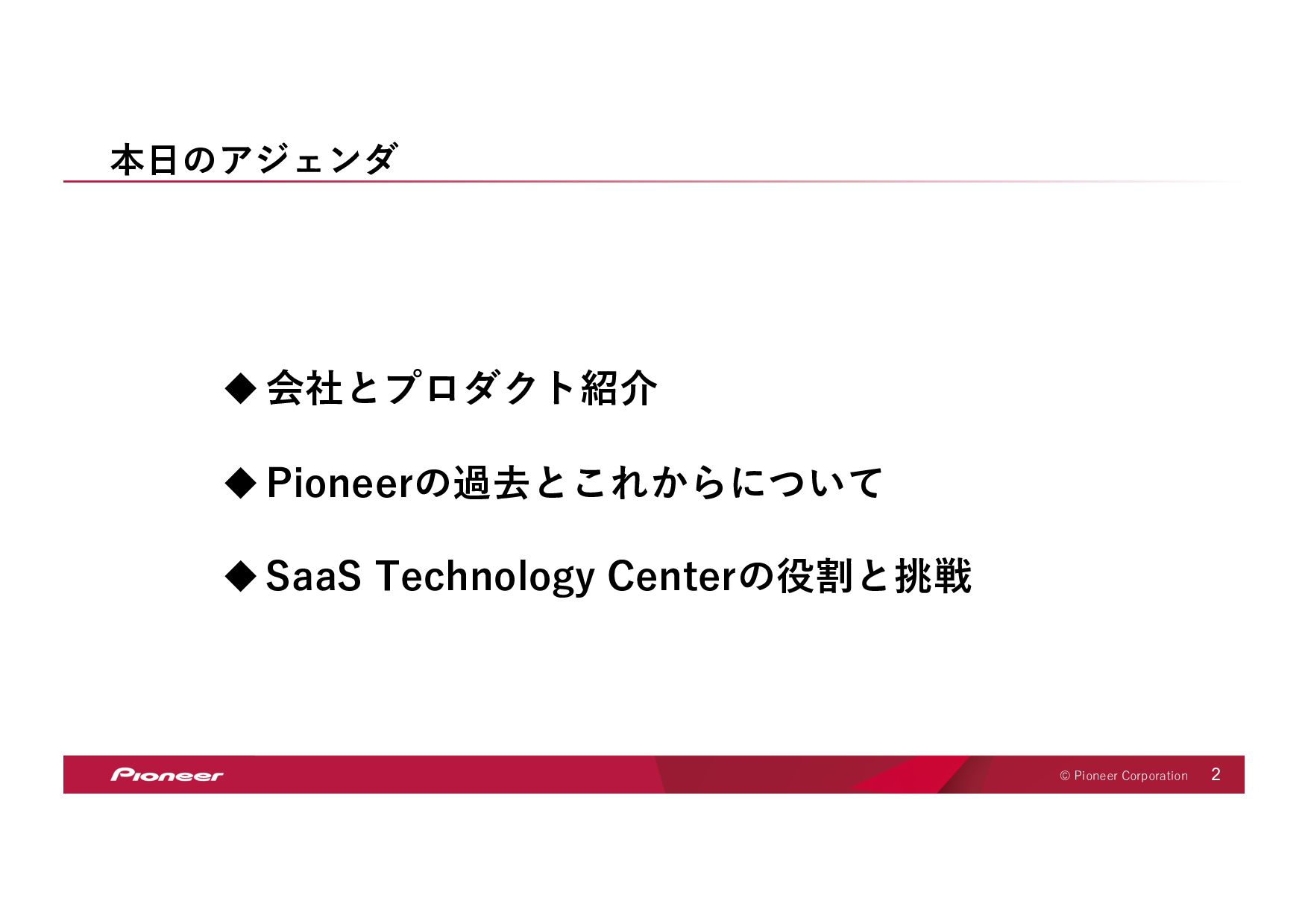 SaaS Technology のプロフェッショナル集団となり、 未来の移動体験を創造してお客様のモビリティライフを豊かにします SaaS Technology Centerはパイオニア全体のビジネスを⽀え、持ち上げ 「モノ」から「モノ×コト」へ変⾰させていきます そして、新しい開拓者となり、パイオニアは⽣まれ変わります LIFT SHIFT Pioneer 貢献意欲 One for all, All for one! ⾼い視座で⾜りない部分を補い合いながら 組織・パイオニアへの貢献を最⼤化する スピード Try and Error ! 超⾼回転PDCAが⽣む圧倒的スピードで ⽬標への最短経路を進み続ける 挑戦 Beyond it ! これまでにない⽬標へ⼤胆に挑戦し 失敗は認め合い、共に前進する Value