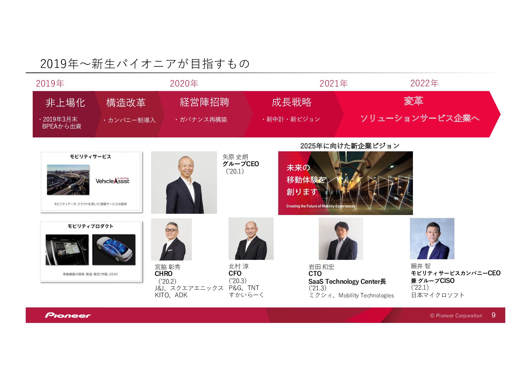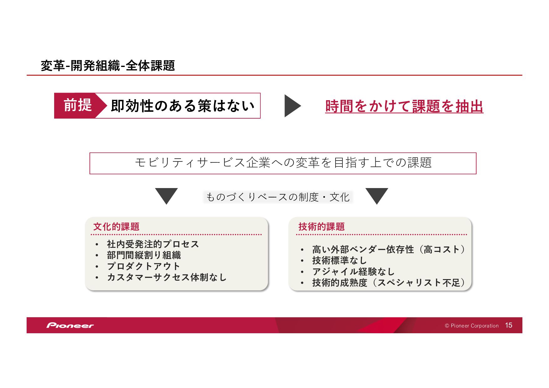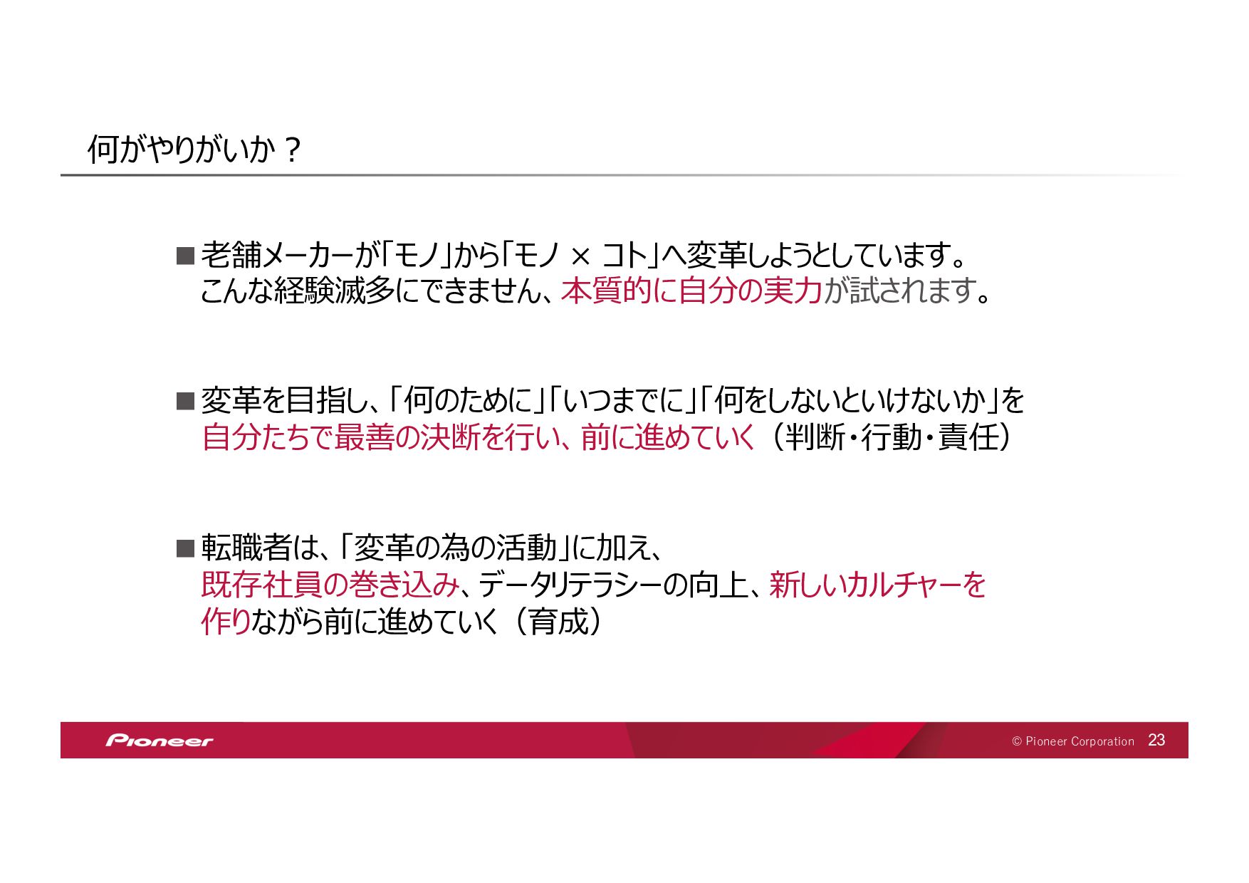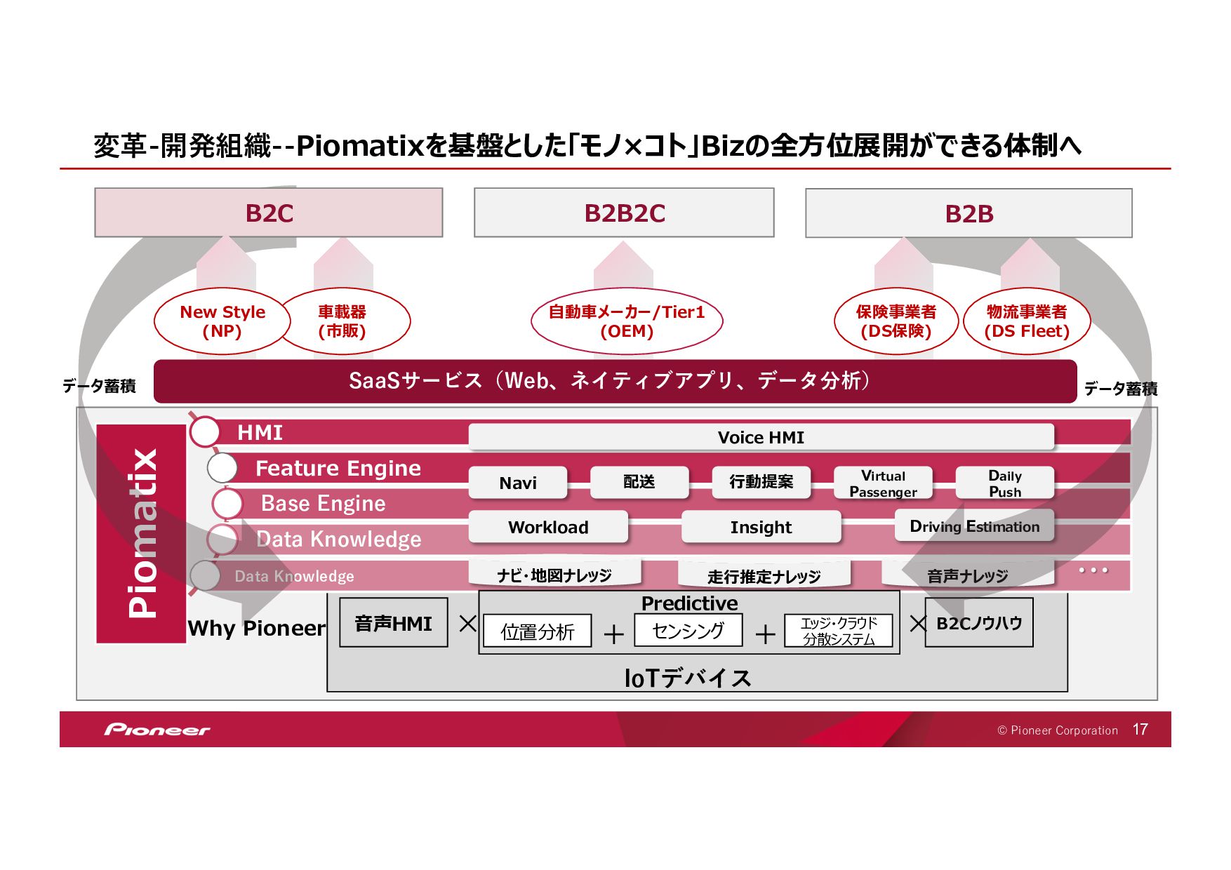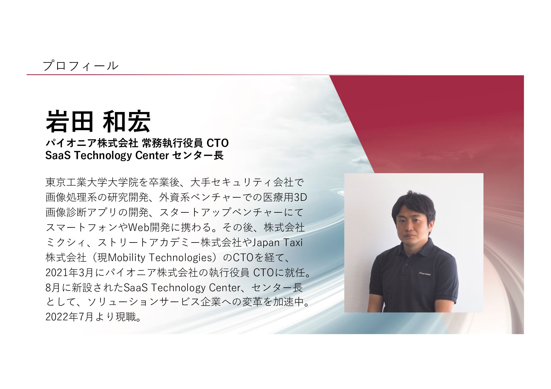 SaaS Technology のプロフェッショナル集団となり、 未来の移動体験を創造してお客様のモビリティライフを豊かにします SaaS Technology Centerはパイオニア全体のビジネスを⽀え、持ち上げ 「モノ」から「モノ×コト」へ変⾰させていきます そして、新しい開拓者となり、パイオニアは⽣まれ変わります LIFT SHIFT Pioneer 貢献意欲 One for all, All for one! ⾼い視座で⾜りない部分を補い合いながら 組織・パイオニアへの貢献を最⼤化する スピード Try and Error ! 超⾼回転PDCAが⽣む圧倒的スピードで ⽬標への最短経路を進み続ける 挑戦 Beyond it ! これまでにない⽬標へ⼤胆に挑戦し 失敗は認め合い、共に前進する Value