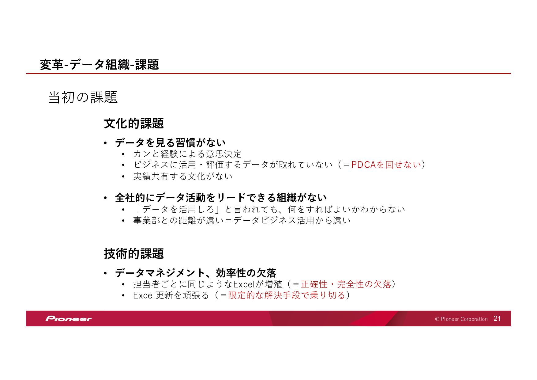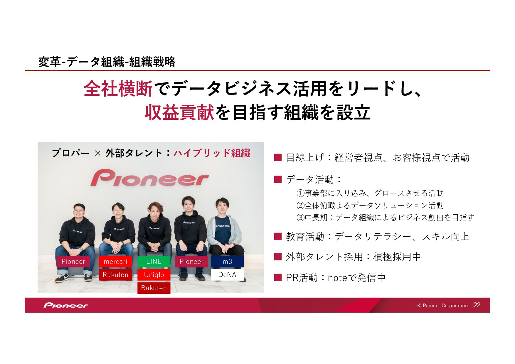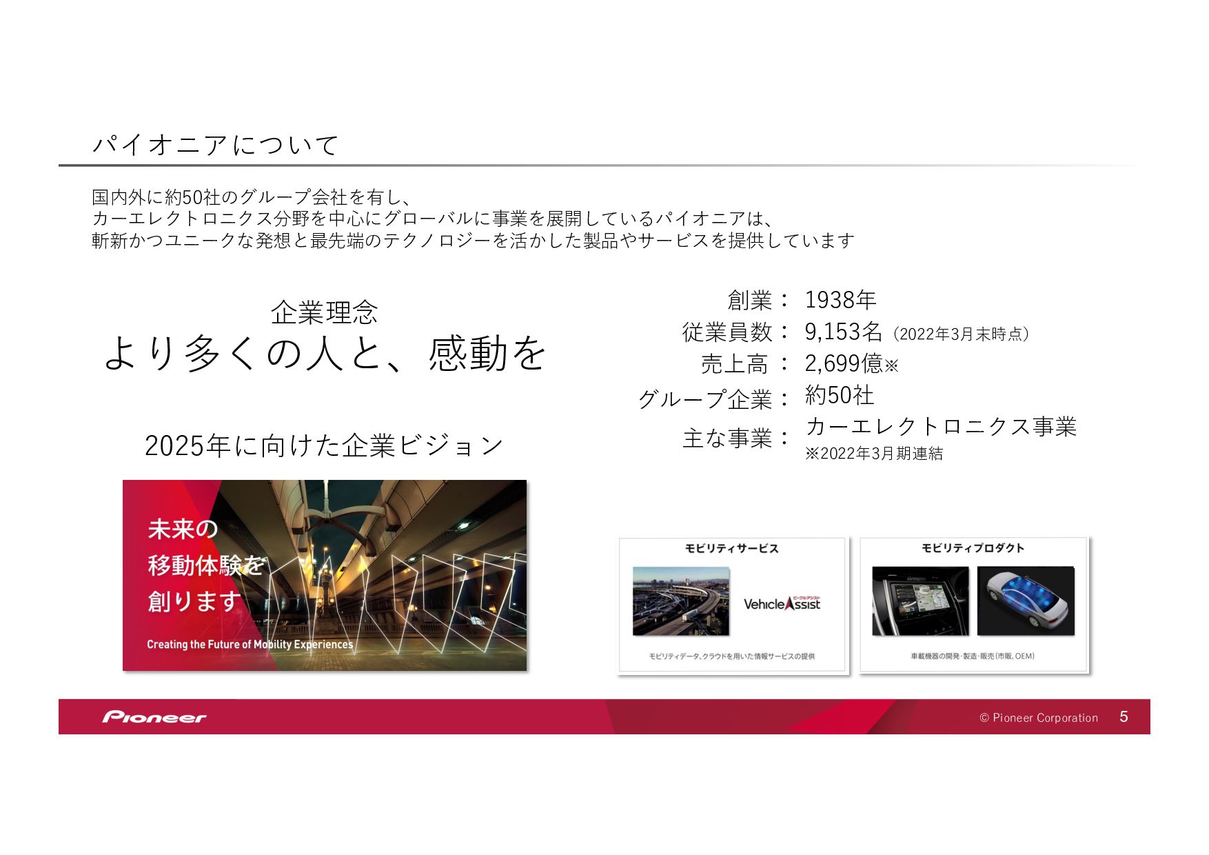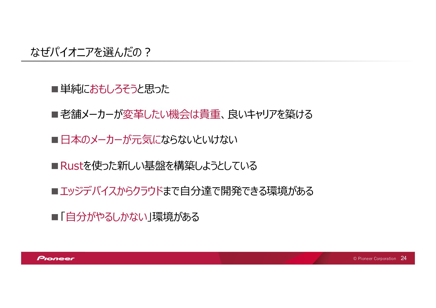 SaaS Technology のプロフェッショナル集団となり、 未来の移動体験を創造してお客様のモビリティライフを豊かにします SaaS Technology Centerはパイオニア全体のビジネスを⽀え、持ち上げ 「モノ」から「モノ×コト」へ変⾰させていきます そして、新しい開拓者となり、パイオニアは⽣まれ変わります LIFT SHIFT Pioneer 貢献意欲 One for all, All for one! ⾼い視座で⾜りない部分を補い合いながら 組織・パイオニアへの貢献を最⼤化する スピード Try and Error ! 超⾼回転PDCAが⽣む圧倒的スピードで ⽬標への最短経路を進み続ける 挑戦 Beyond it ! これまでにない⽬標へ⼤胆に挑戦し 失敗は認め合い、共に前進する Value