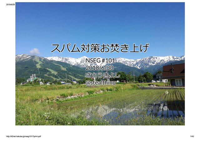 2018/6/30の NSEG #101 https://nseg.connpass.com/event/89567/ での発表プレゼン資料です。 以前自分が考案したスパム対策手法taRgreyのおさらいし、taRgreyの現在の状況ログからスパムの現状を話します。