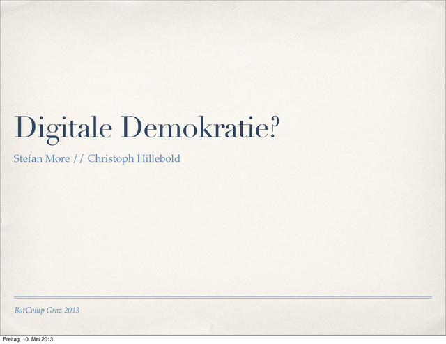 PC ✤ Einfacher => höhere Wahlbeteiligung? ✤ (Vom Smartphone) ✤ Keine neutralen Wahllokale, keine Urnen, keine Stimmzettel ✤ Ermöglicht Formen á la Liquid Democracy Freitag, 10. Mai 2013