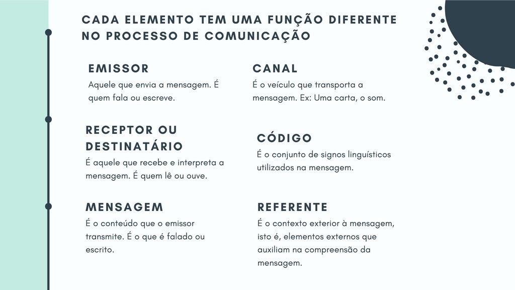 escreve. RECEPTOR OU DESTINATÁRIO É aquele que recebe e interpreta a mensagem. É quem lê ou ouve. MENSAGEM É o conteúdo que o emissor transmite. É o que é falado ou escrito. CANAL É o veículo que transporta a mensagem. Ex: Uma carta, o som. CÓDIGO É o conjunto de signos linguísticos utilizados na mensagem. REFERENTE É o contexto exterior à mensagem, isto é, elementos externos que auxiliam na compreensão da mensagem. CADA ELEMENTO TEM UMA FUNÇÃO DIFERENTE NO PROCESSO DE COMUNICAÇÃO