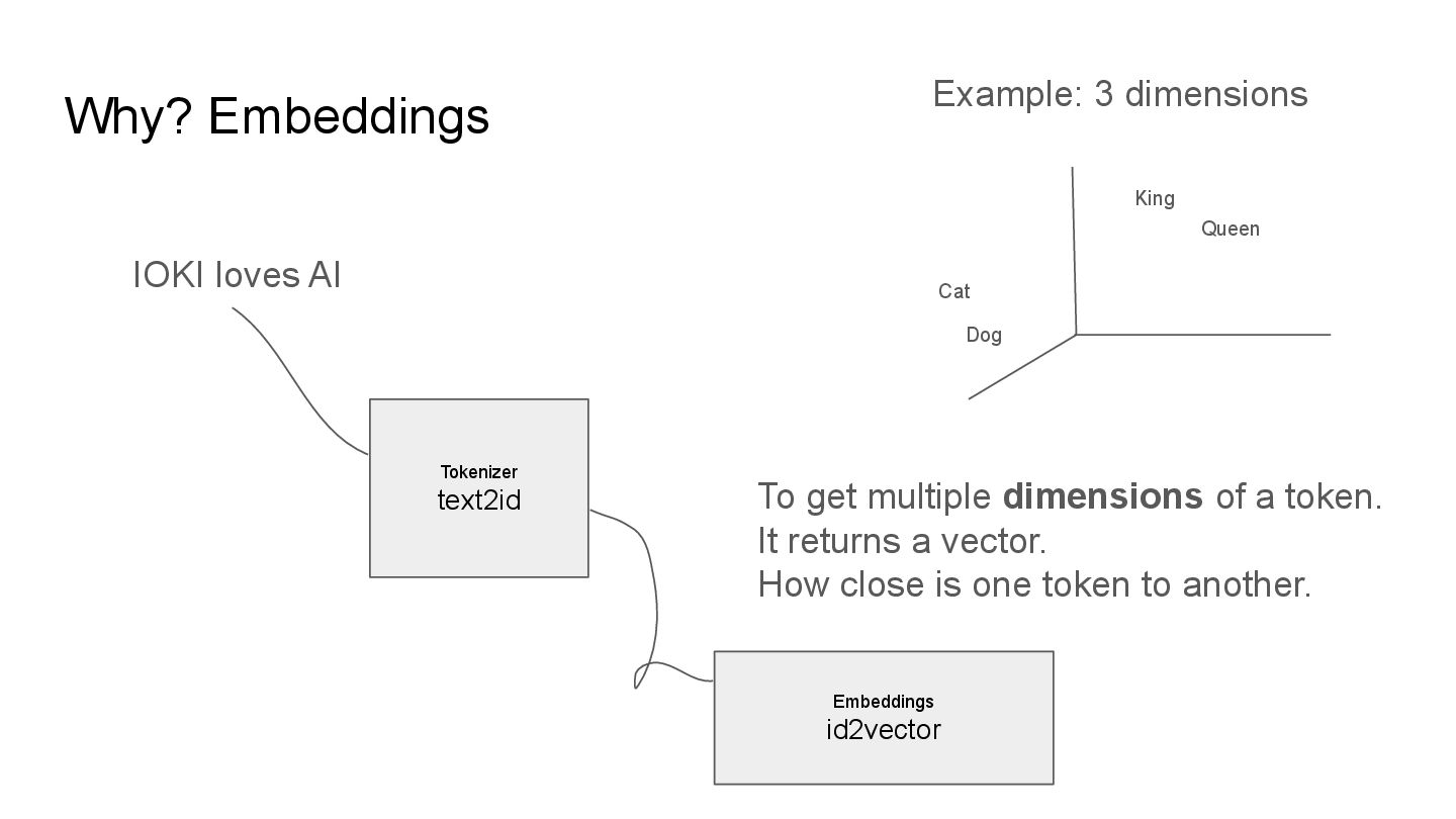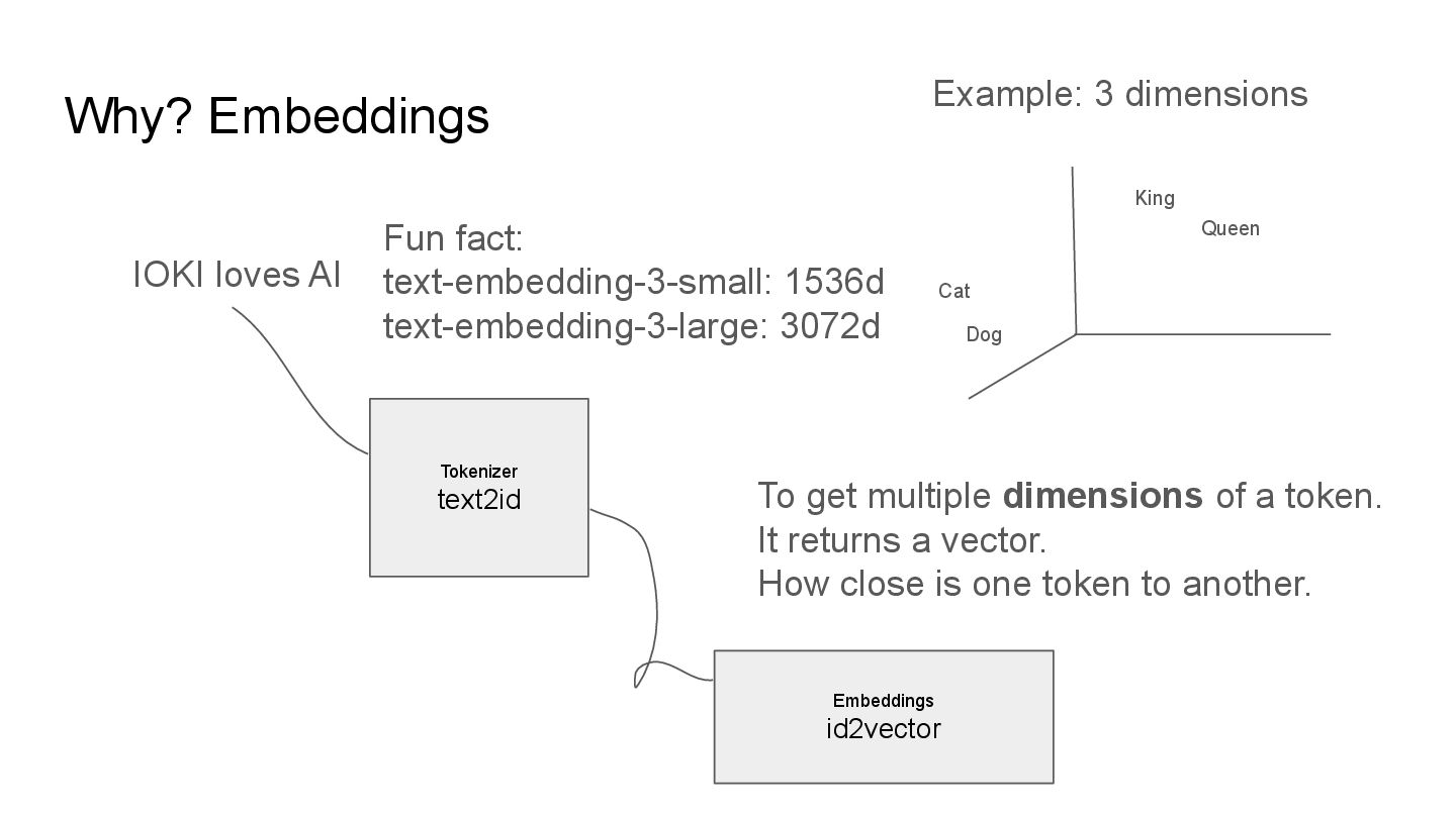 get multiple dimensions of a token. It returns a vector. How close is one token to another. Fun fact: text-embedding-3-small: 1536d text-embedding-3-large: 3072d King Queen Cat Dog Example: 3 dimensions