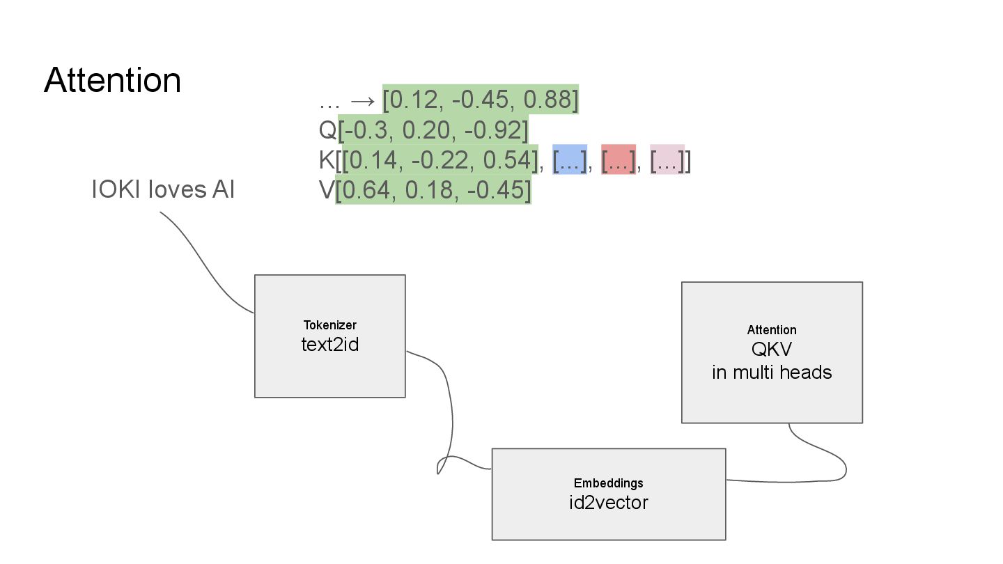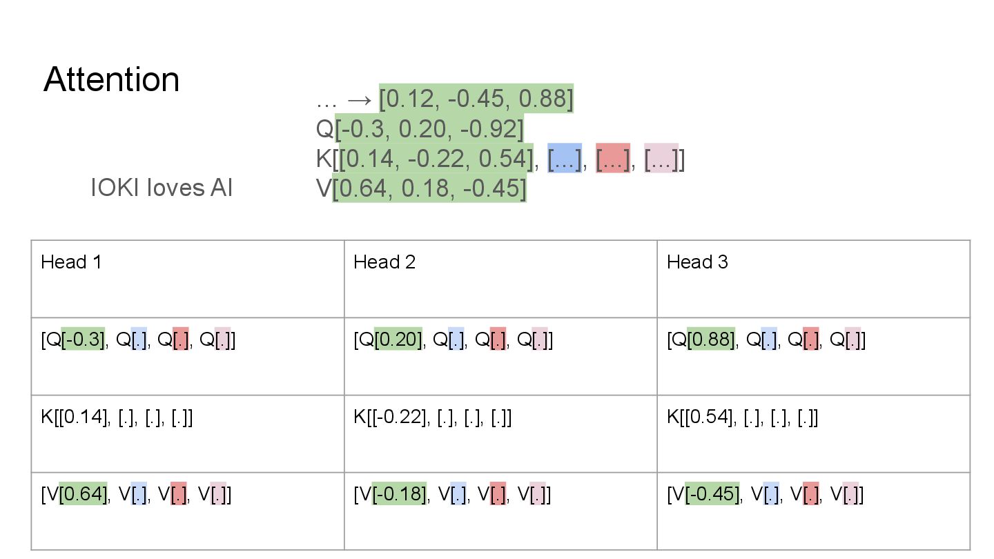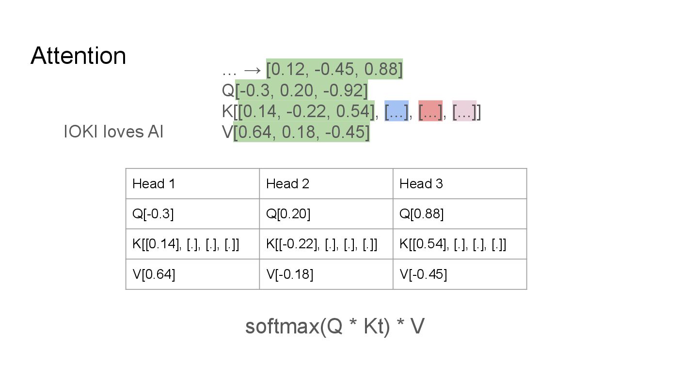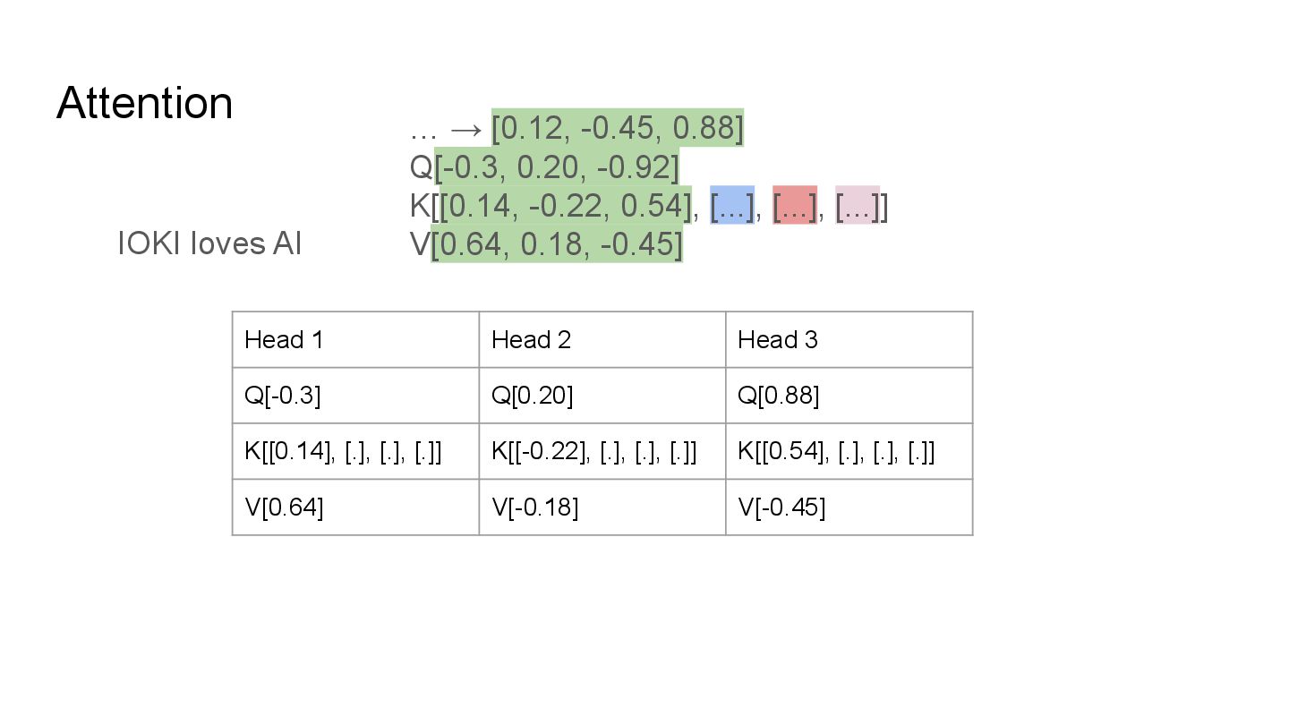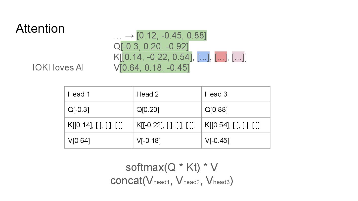 QKV in multi heads IOKI IOKI(0.20) loves(0.30) AI(0.50) loves IOKI(0.46) loves(0.10) AI(0.53) AI IOKI(0.76) loves(0.14) AI(0.10) How much each token vector attend to another