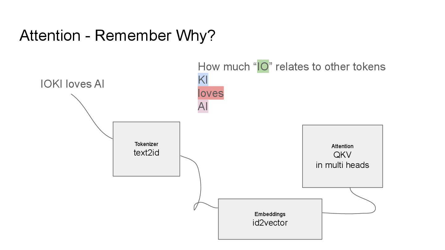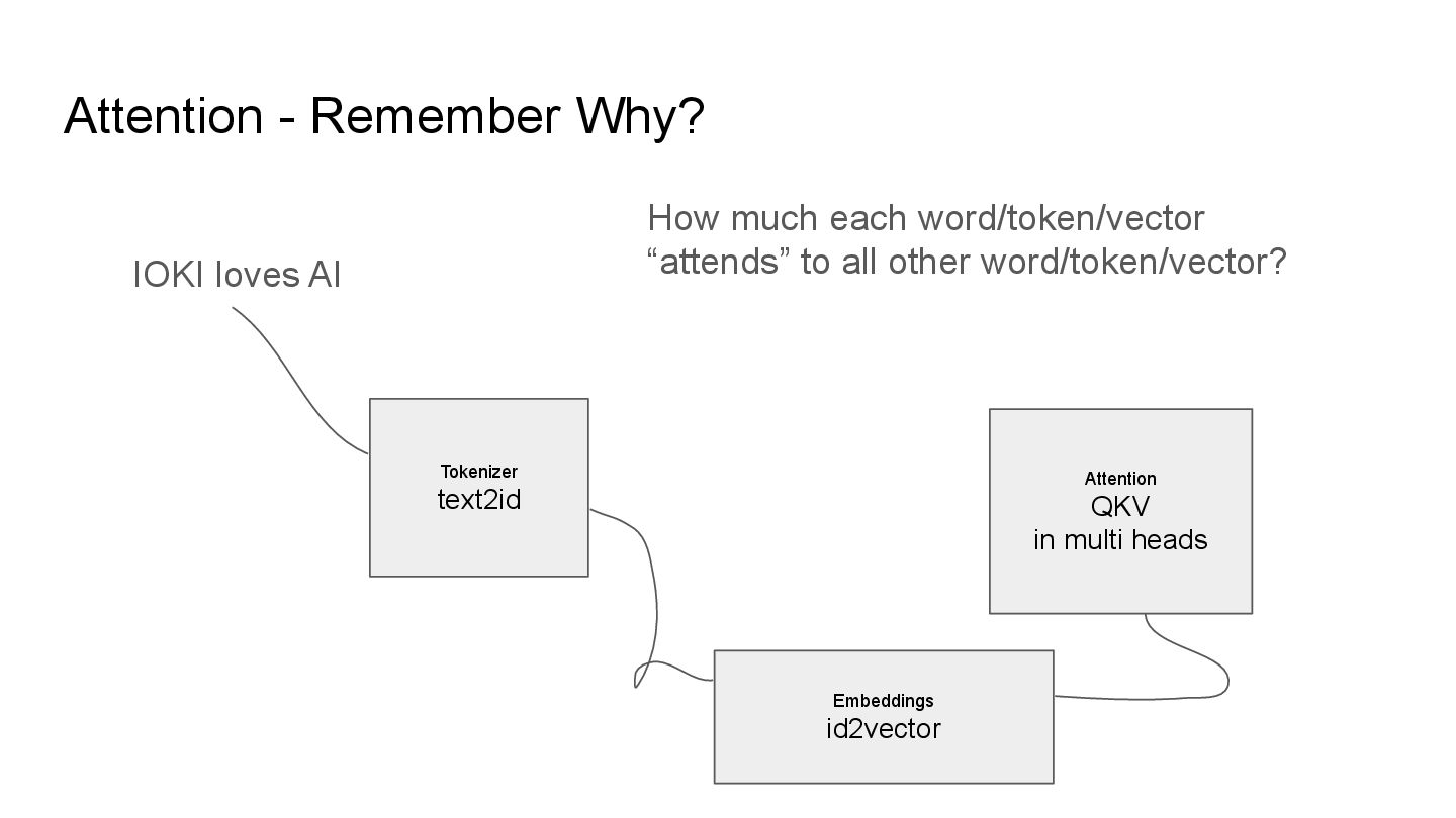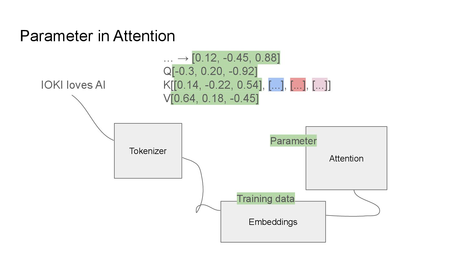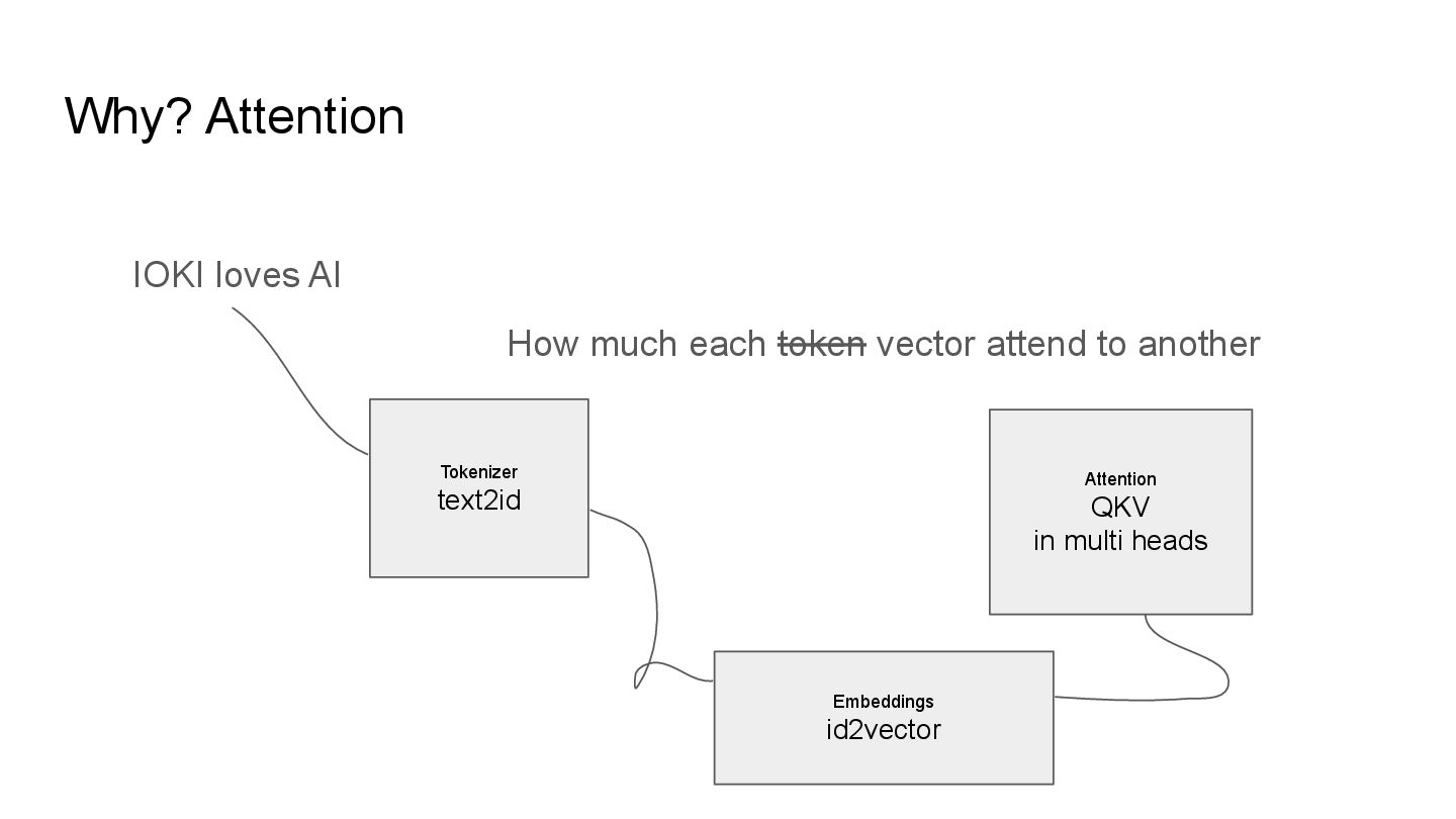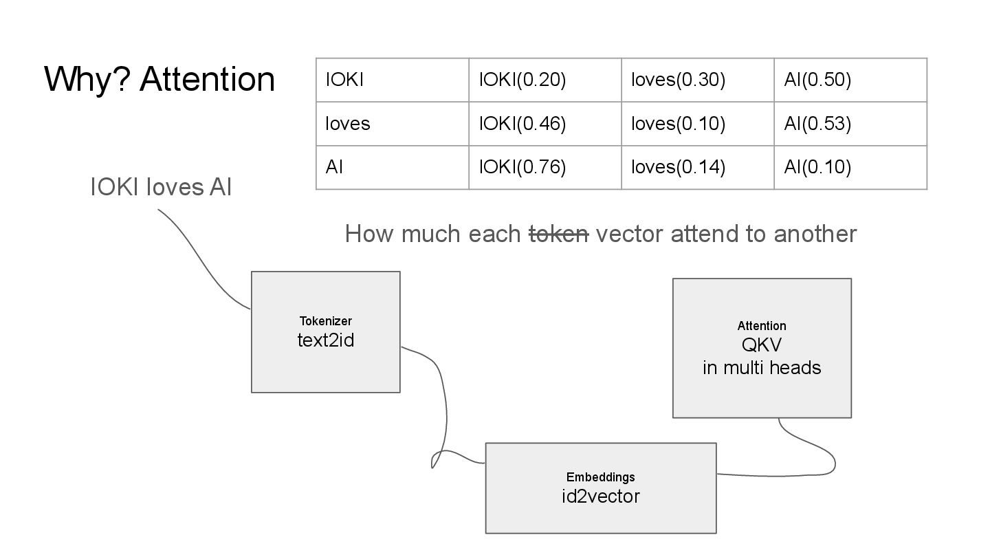 QKV in multi heads IOKI IOKI(0.20) loves(0.30) AI(0.50) loves IOKI(0.46) loves(0.10) AI(0.53) AI IOKI(0.76) loves(0.14) AI(0.10) How much each token vector attend to another