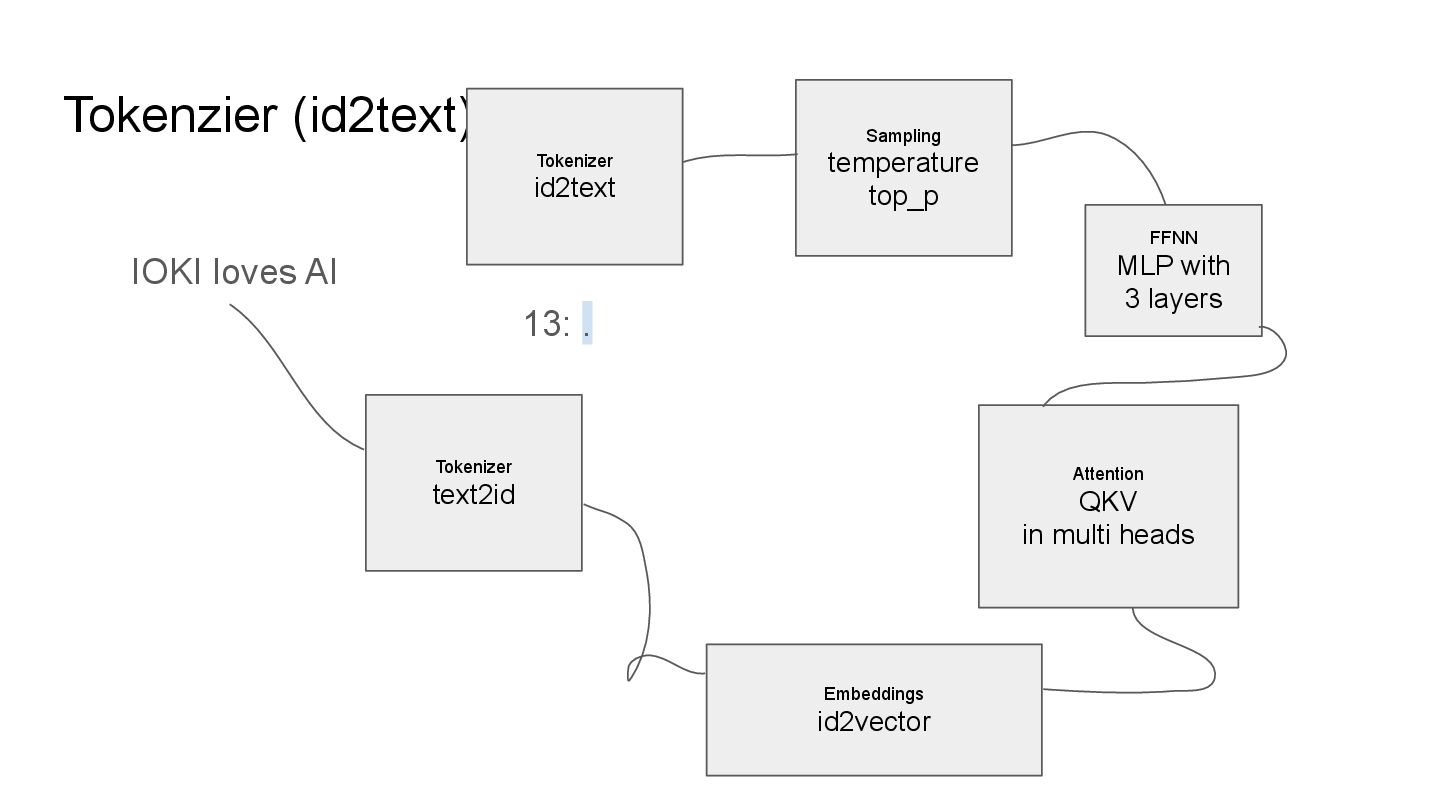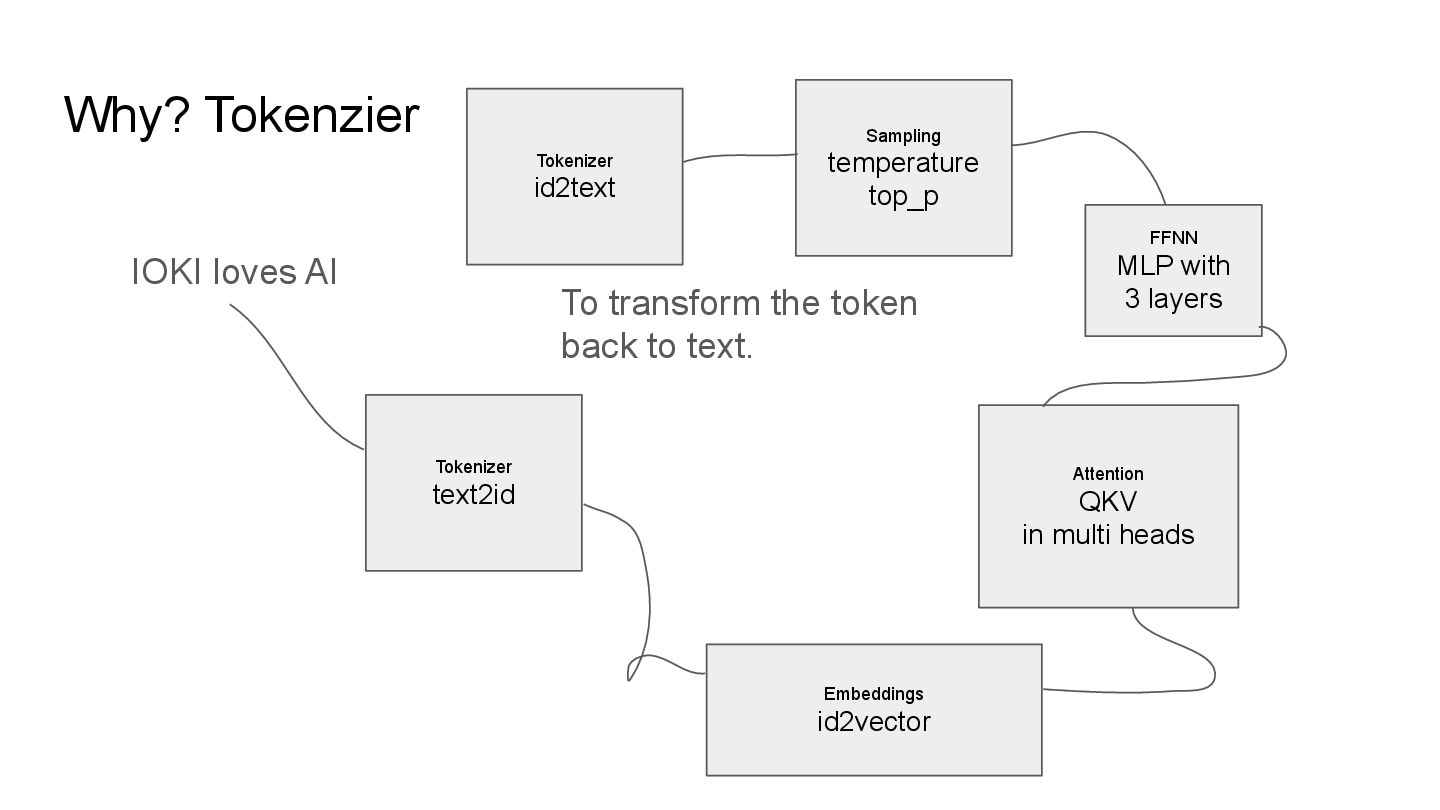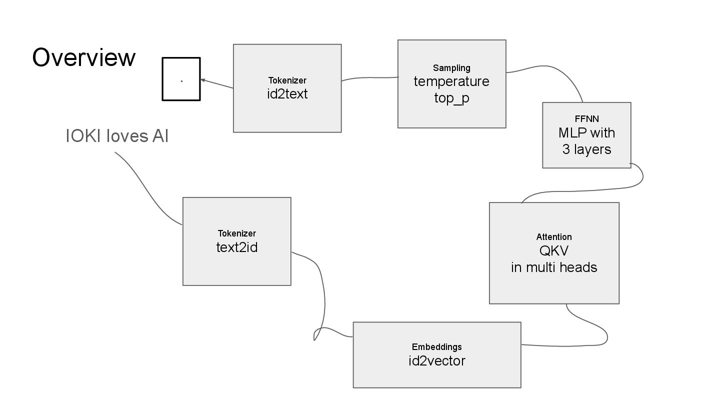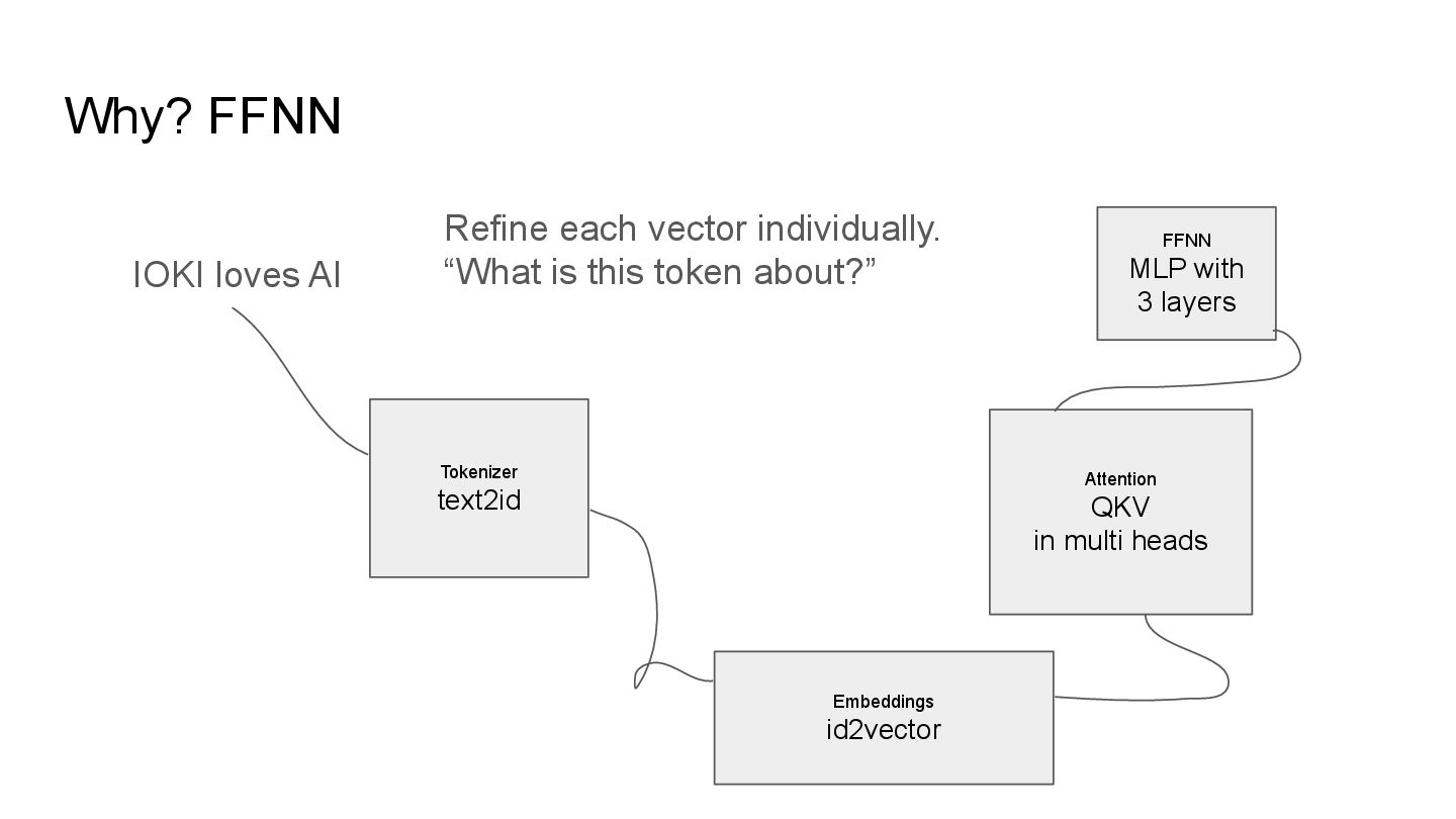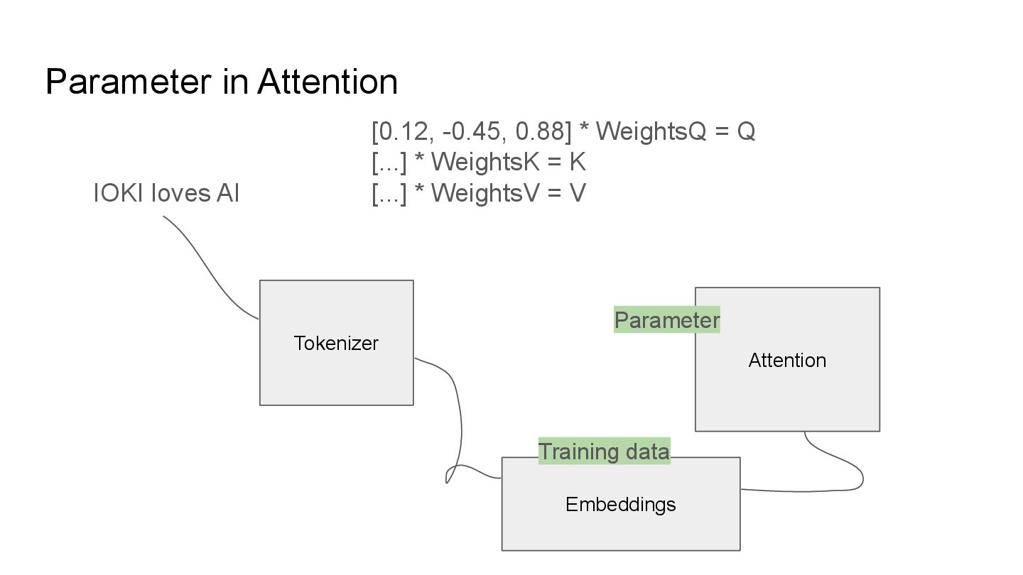 QKV in multi heads IOKI IOKI(0.20) loves(0.30) AI(0.50) loves IOKI(0.46) loves(0.10) AI(0.53) AI IOKI(0.76) loves(0.14) AI(0.10) How much each token vector attend to another