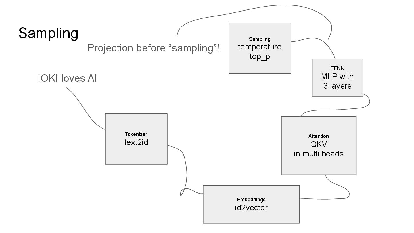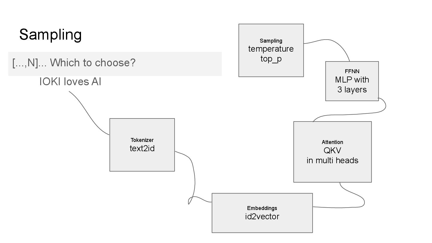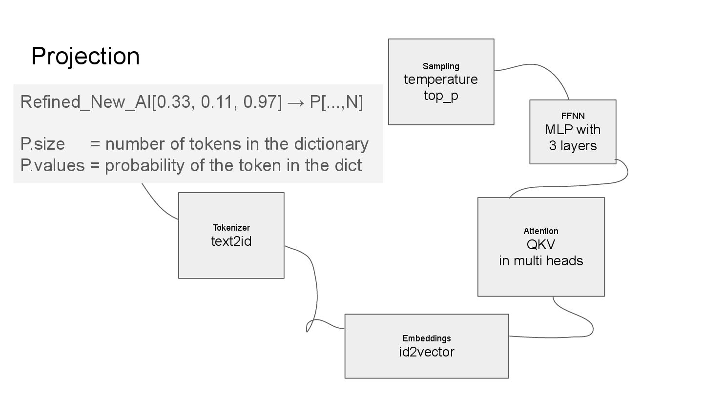 in multi heads FFNN MLP with 3 layers Sampling temperature top_p Refined_New_AI[0.33, 0.11, 0.97] → P[...,N] P.size = number of tokens in the dictionary P.values = probability of the token in the dict