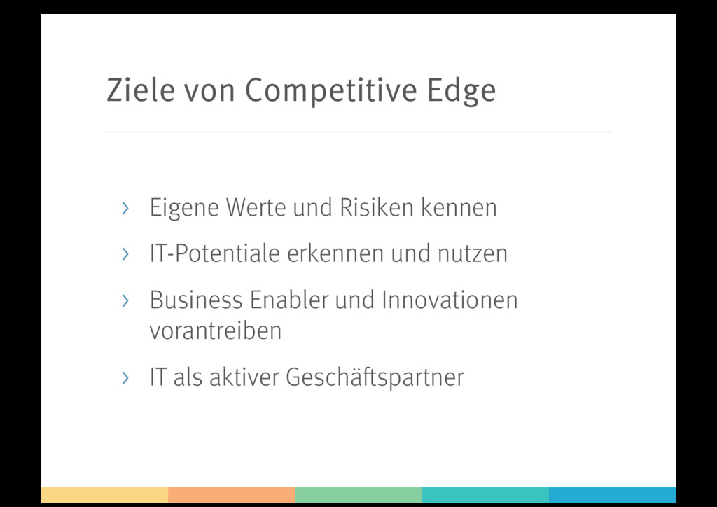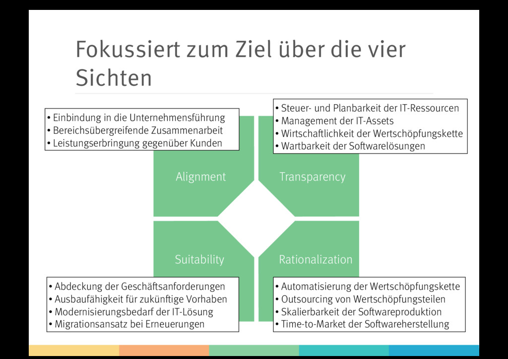 Rationalization • Einbindung in die Unternehmensführung • Bereichsübergreifende Zusammenarbeit • Leistungserbringung gegenüber Kunden • Steuer- und Planbarkeit der IT-Ressourcen • Management der IT-Assets • Wirtschaftlichkeit der Wertschöpfungskette • Wartbarkeit der Softwarelösungen • Abdeckung der Geschäftsanforderungen • Ausbaufähigkeit für zukünftige Vorhaben • Modernisierungsbedarf der IT-Lösung • Migrationsansatz bei Erneuerungen • Automatisierung der Wertschöpfungskette • Outsourcing von Wertschöpfungsteilen • Skalierbarkeit der Softwareproduktion • Time-to-Market der Softwareherstellung