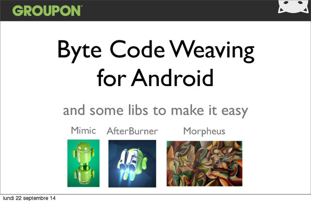 Weaving for Android 1) Dynamic Vs. Static Byte Code Weaving 2) Why Dynamic Byte Code weaving can’t work on Android 3) Transforming classes during Android Post-Compilation build phase 4) Javassist API : much simpler than annotation processing 5) Gradle & Maven examples II. AfterBurner & Mimic : 2 libs to ease Byte Code Weaving on Android 1) Mimic : Templating byte code injection 2) Mimic : a simple use case 3) AfterBurner : Fluent API for byte code injection 4) AfterBurner : a simple use case lundi 22 septembre 14