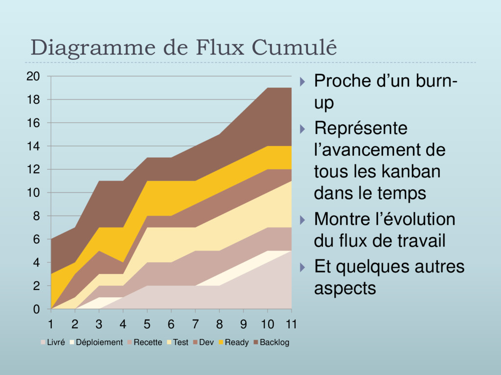 Représente l’avancement de tous les kanban dans le temps Montre l’évolution du flux de travail Et quelques autres aspects 0 2 4 6 8 10 12 14 16 18 20 1 2 3 4 5 6 7 8 9 10 11 Livré Déploiement Recette Test Dev Ready Backlog