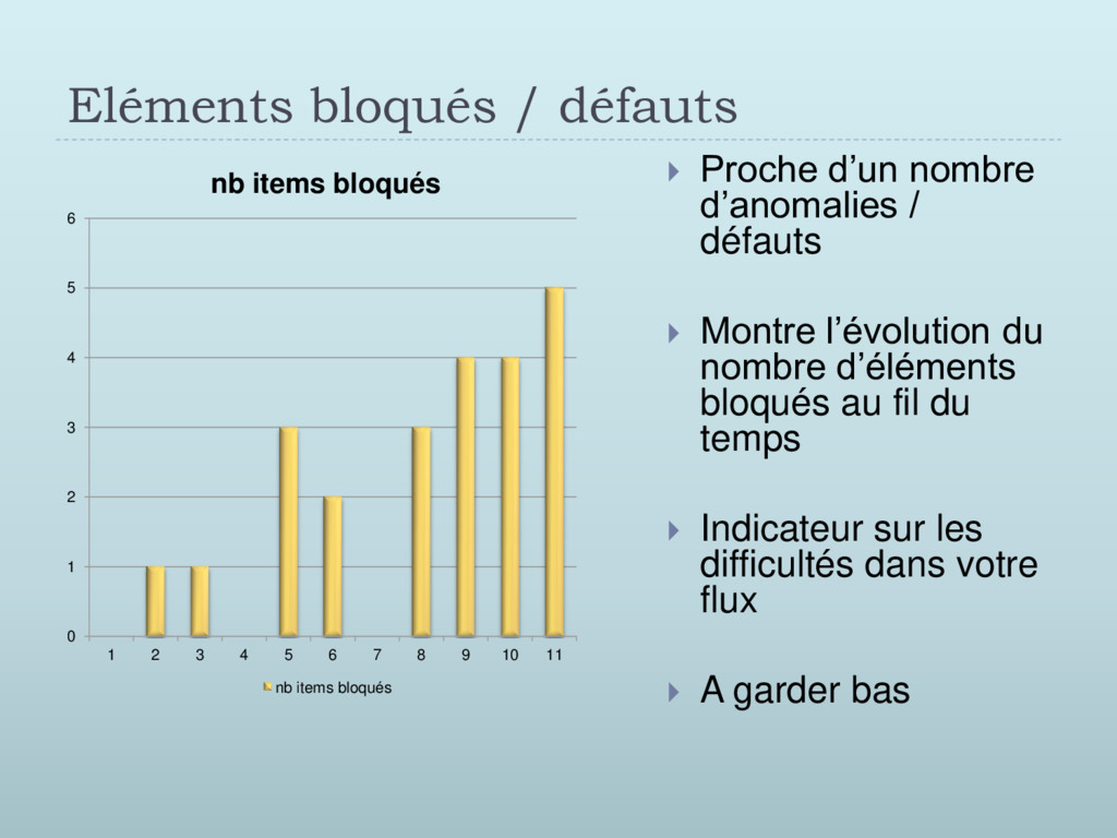 6 1 2 3 4 5 6 7 8 9 10 11 nb items bloqués nb items bloqués Proche d’un nombre d’anomalies / défauts Montre l’évolution du nombre d’éléments bloqués au fil du temps Indicateur sur les difficultés dans votre flux A garder bas