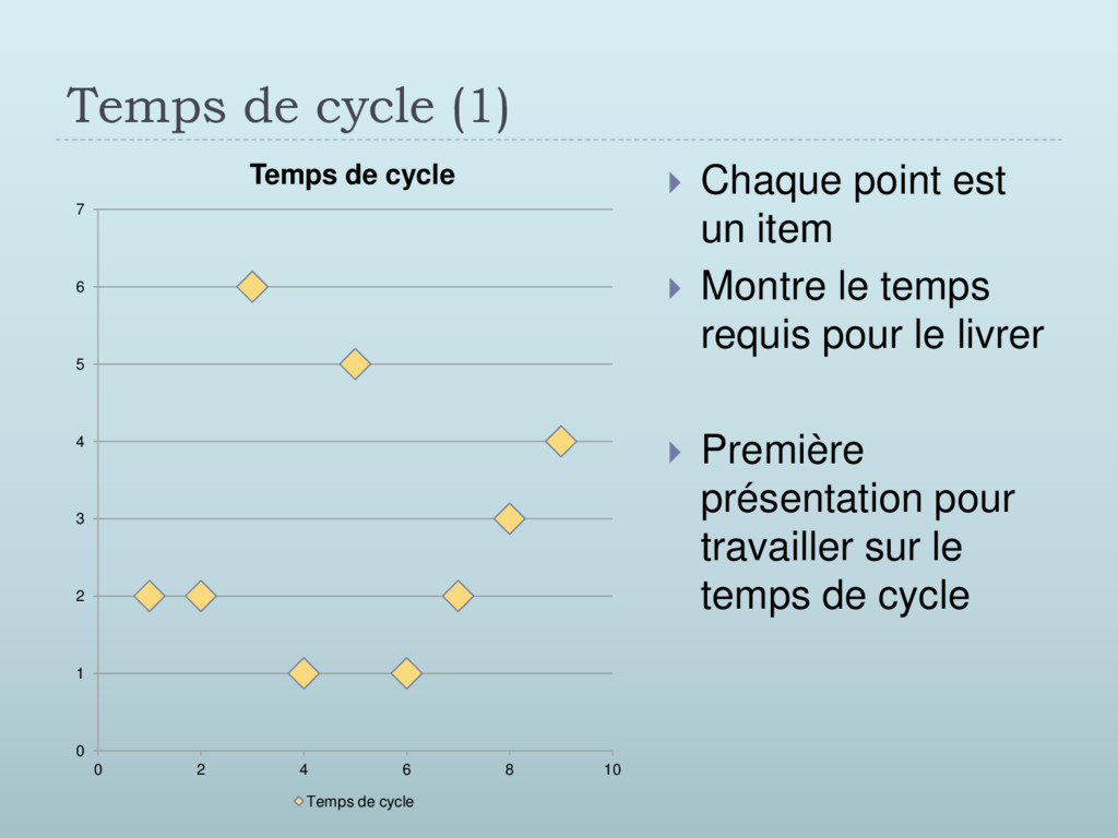 6 7 0 2 4 6 8 10 Temps de cycle Temps de cycle Chaque point est un item Montre le temps requis pour le livrer Première présentation pour travailler sur le temps de cycle
