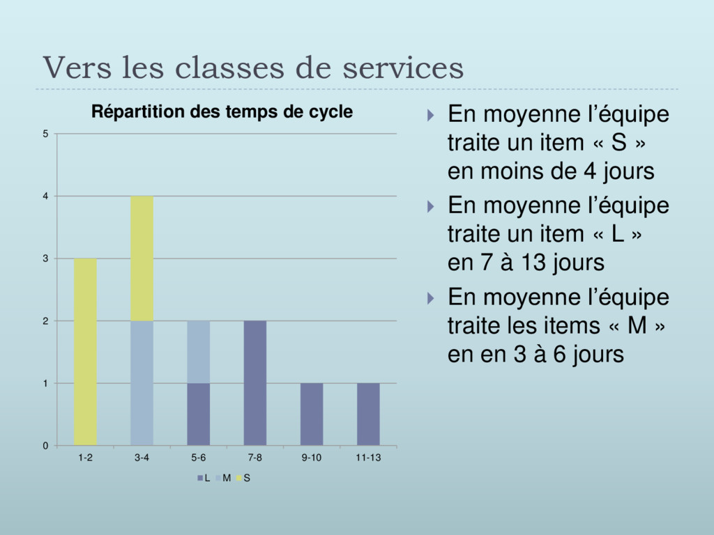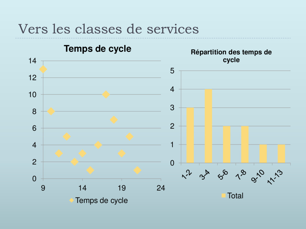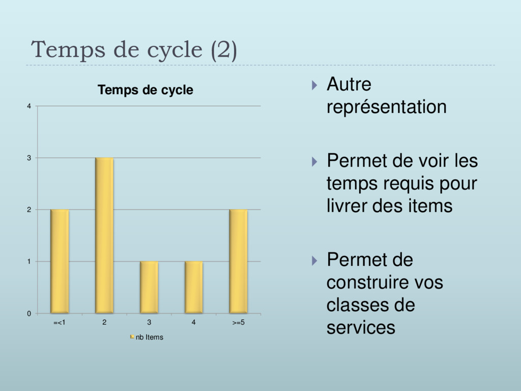 2 3 4 >=5 Temps de cycle nb Items Autre représentation Permet de voir les temps requis pour livrer des items Permet de construire vos classes de services