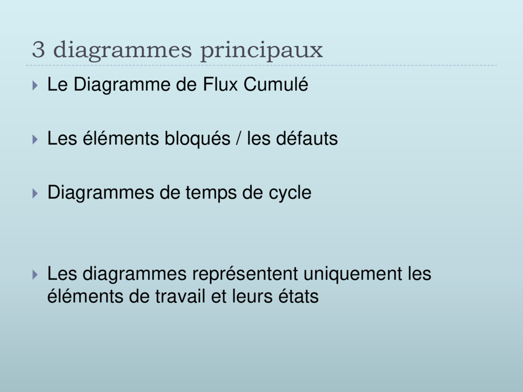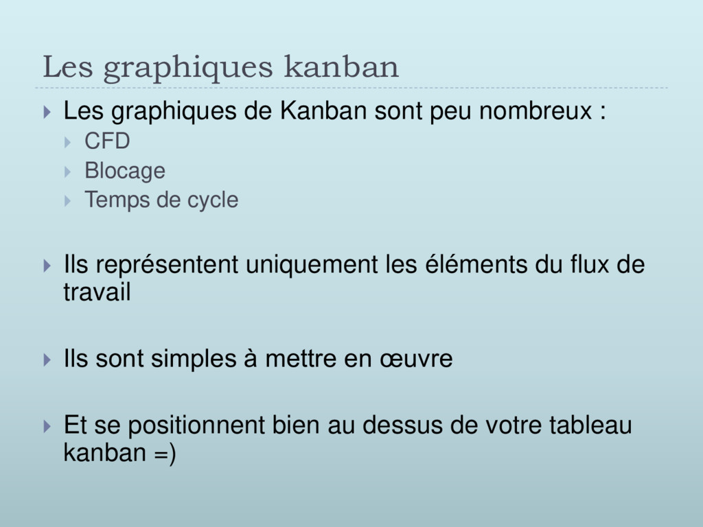 nombreux : CFD Blocage Temps de cycle Ils représentent uniquement les éléments du flux de travail Ils sont simples à mettre en œuvre Et se positionnent bien au dessus de votre tableau kanban =)