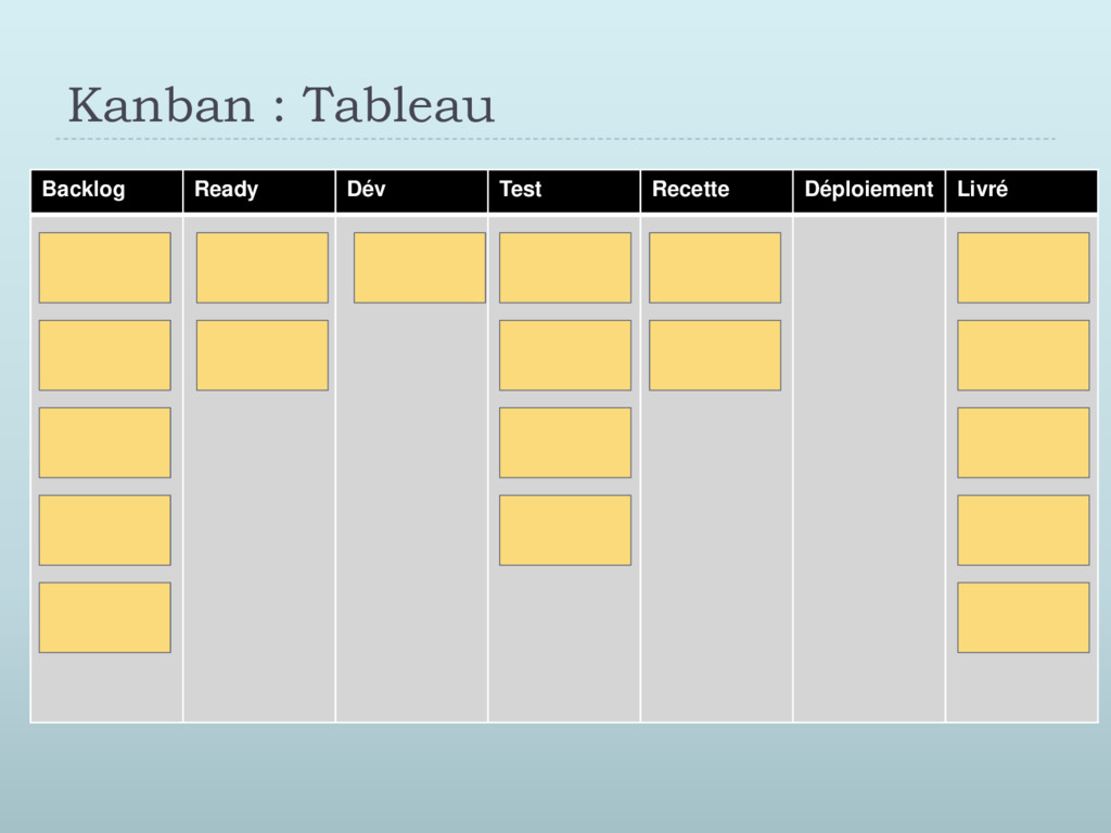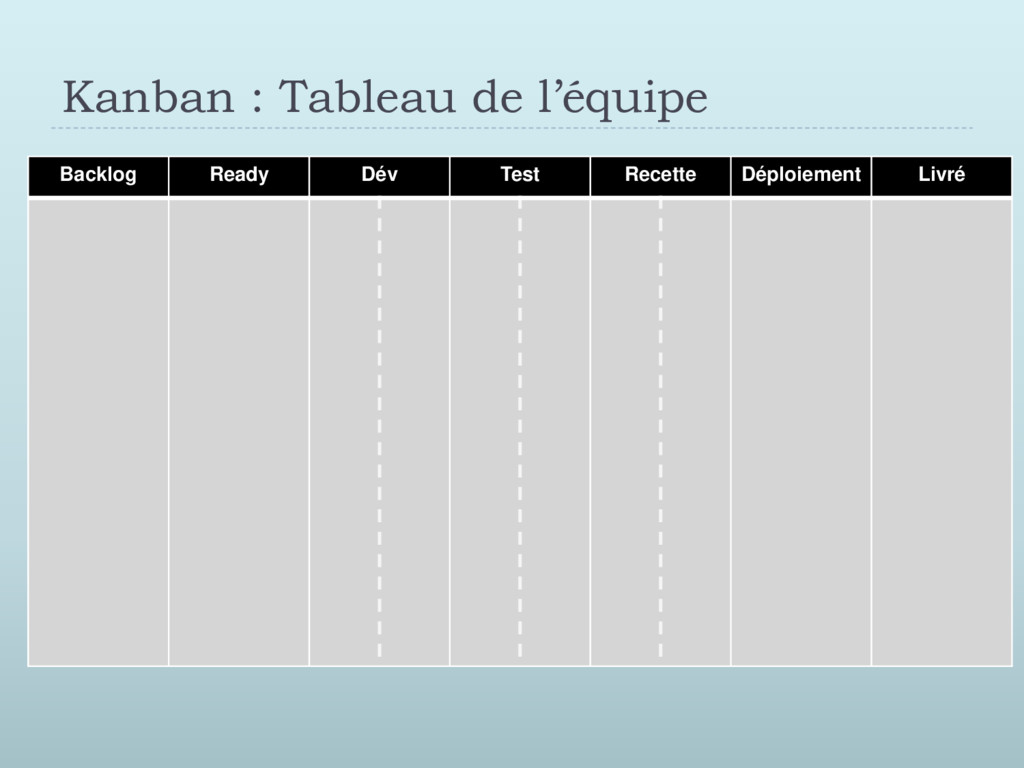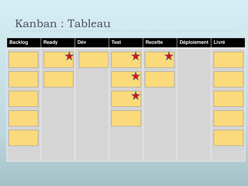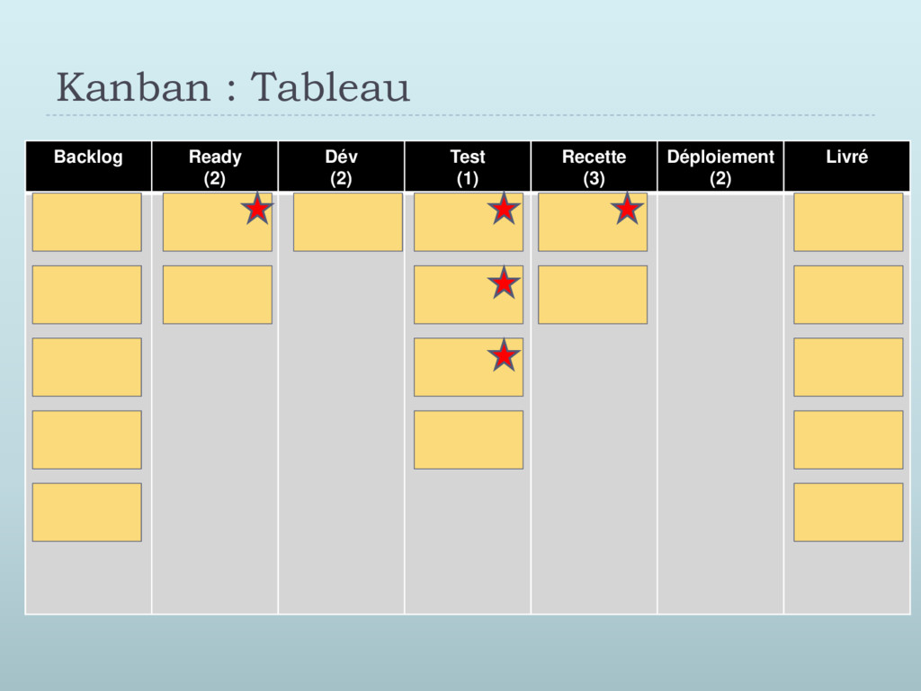 60 70 1 2 3 4 5 6 7 8 9 10 Backlog Prêt Dev Dev - Fini Test Test - Fini Recette Recette - Fini Déploiement Terminé Etat du système dans lequel le flux avance en tendant vers la stabilité et la constance