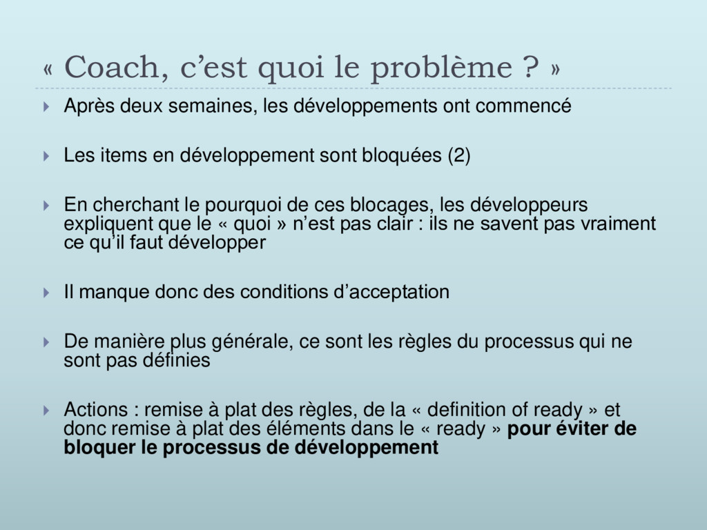 deux semaines, les développements ont commencé Les items en développement sont bloquées (2) En cherchant le pourquoi de ces blocages, les développeurs expliquent que le « quoi » n’est pas clair : ils ne savent pas vraiment ce qu’il faut développer Il manque donc des conditions d’acceptation De manière plus générale, ce sont les règles du processus qui ne sont pas définies Actions : remise à plat des règles, de la « definition of ready » et donc remise à plat des éléments dans le « ready » pour éviter de bloquer le processus de développement