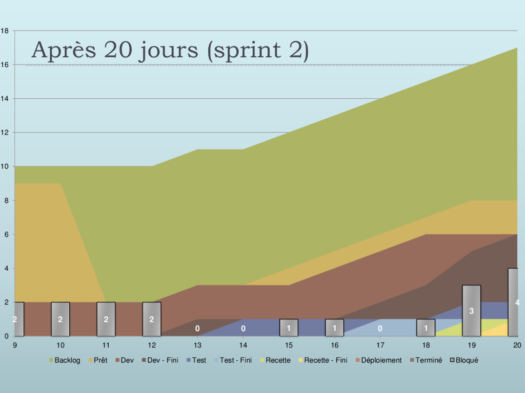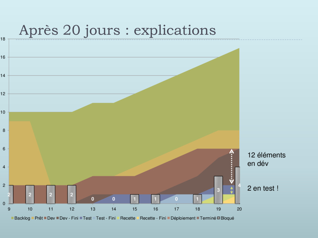 3 4 0 2 4 6 8 10 12 14 16 18 9 10 11 12 13 14 15 16 17 18 19 20 Backlog Prêt Dev Dev - Fini Test Test - Fini Recette Recette - Fini Déploiement Terminé Bloqué Après 20 jours : explications 12 éléments en dév 2 en test !