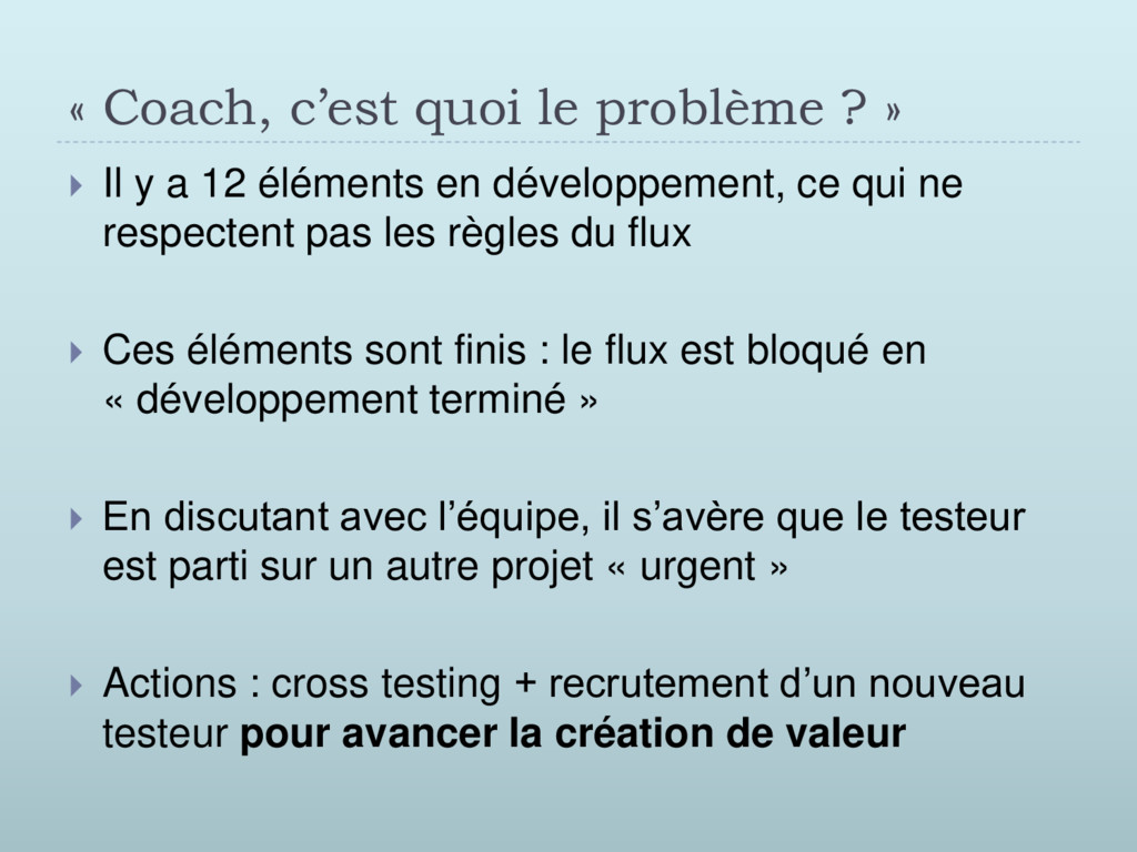 y a 12 éléments en développement, ce qui ne respectent pas les règles du flux Ces éléments sont finis : le flux est bloqué en « développement terminé » En discutant avec l’équipe, il s’avère que le testeur est parti sur un autre projet « urgent » Actions : cross testing + recrutement d’un nouveau testeur pour avancer la création de valeur