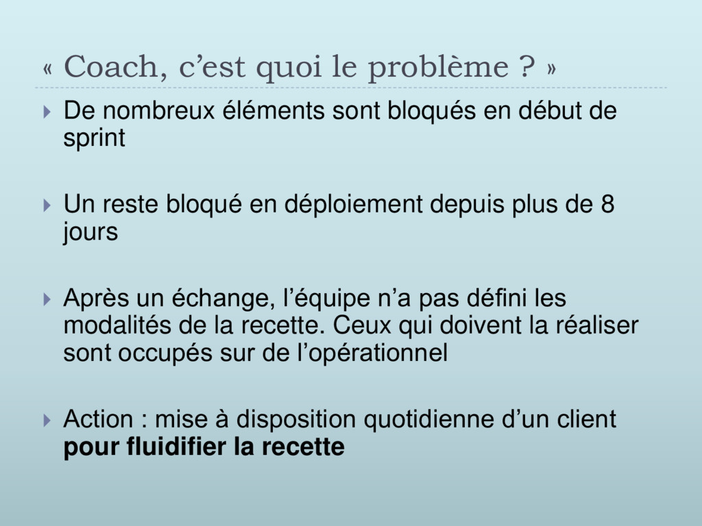 nombreux éléments sont bloqués en début de sprint Un reste bloqué en déploiement depuis plus de 8 jours Après un échange, l’équipe n’a pas défini les modalités de la recette. Ceux qui doivent la réaliser sont occupés sur de l’opérationnel Action : mise à disposition quotidienne d’un client pour fluidifier la recette