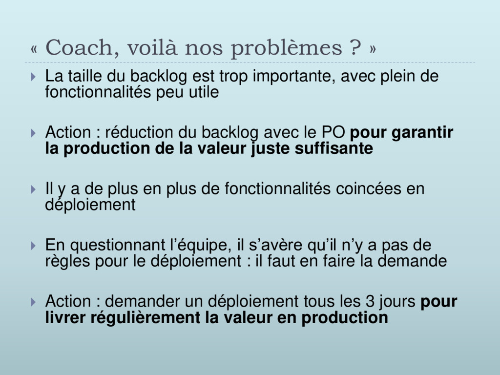 du backlog est trop importante, avec plein de fonctionnalités peu utile Action : réduction du backlog avec le PO pour garantir la production de la valeur juste suffisante Il y a de plus en plus de fonctionnalités coincées en déploiement En questionnant l’équipe, il s’avère qu’il n’y a pas de règles pour le déploiement : il faut en faire la demande Action : demander un déploiement tous les 3 jours pour livrer régulièrement la valeur en production