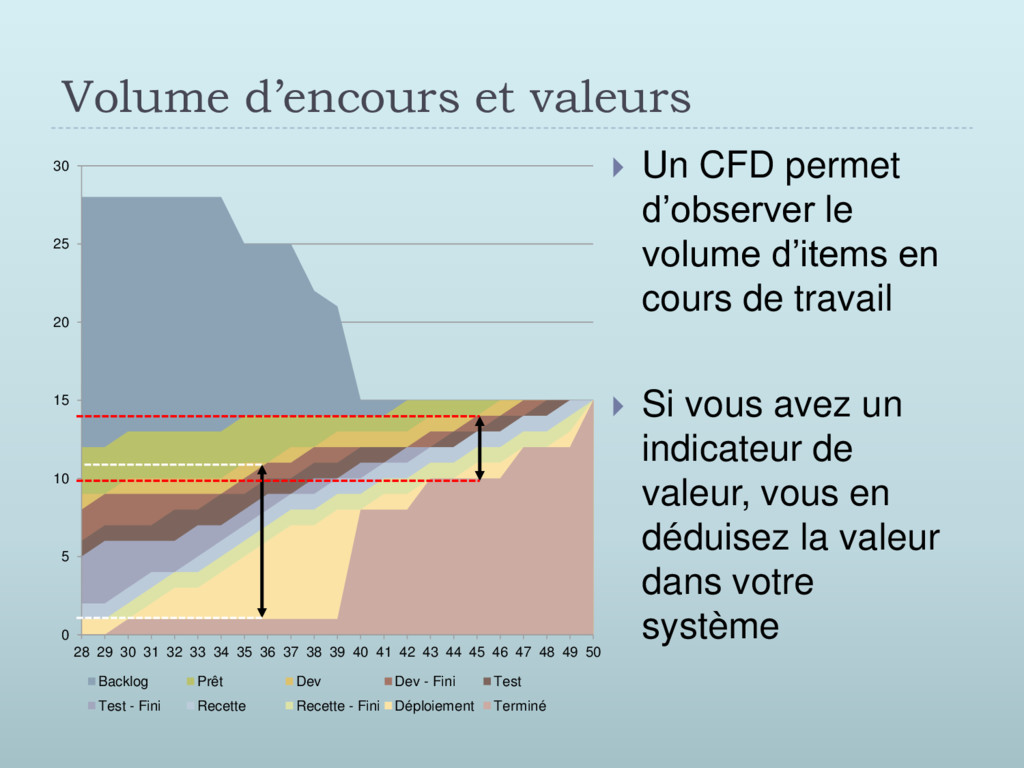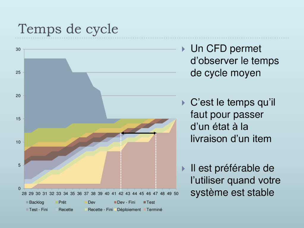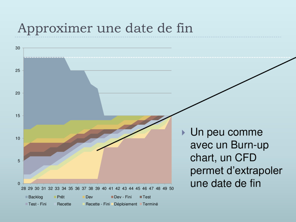 25 30 28 29 30 31 32 33 34 35 36 37 38 39 40 41 42 43 44 45 46 47 48 49 50 Backlog Prêt Dev Dev - Fini Test Test - Fini Recette Recette - Fini Déploiement Terminé Un peu comme avec un Burn-up chart, un CFD permet d’extrapoler une date de fin