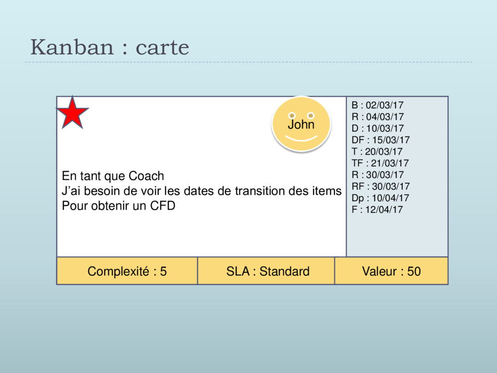 voir les dates de transition des items Pour obtenir un CFD B : 02/03/17 R : 04/03/17 D : 10/03/17 DF : 15/03/17 T : 20/03/17 TF : 21/03/17 R : 30/03/17 RF : 30/03/17 Dp : 10/04/17 F : 12/04/17 Complexité : 5 SLA : Standard Valeur : 50 John