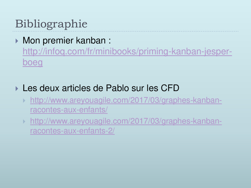 deux articles de Pablo sur les CFD http://www.areyouagile.com/2017/03/graphes-kanban- racontes-aux-enfants/ http://www.areyouagile.com/2017/03/graphes-kanban- racontes-aux-enfants-2/