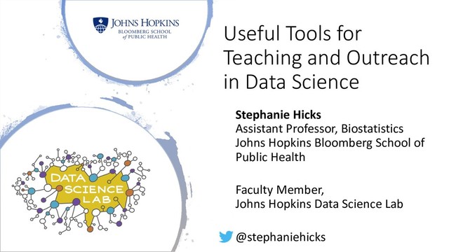 Hicks Assistant Professor, Biostatistics Johns Hopkins Bloomberg School of Public Health Faculty Member, Johns Hopkins Data Science Lab @stephaniehicks