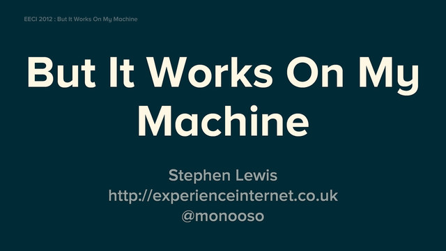 self-contained, and sandboxed The entire team has an identical setup The entire team has an up-to-date setup Remote and mobile workers are supported It’s easy to start a new project based on a “standard” setup Each project is self-contained, and sandboxed EECI 2012 : But It Works On My Machine / Virtual Machines / Benefits The local “server” mirrors the live server The entire team has an identical setup Remote and mobile workers are supported It’s easy to start a new project based on a “standard” setup The entire team has an up-to-date setup